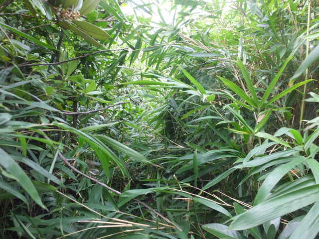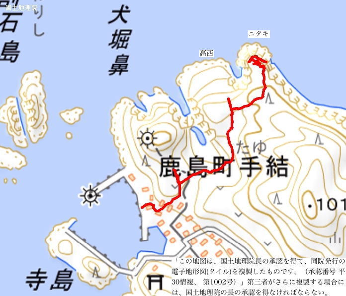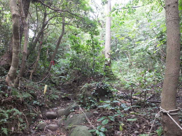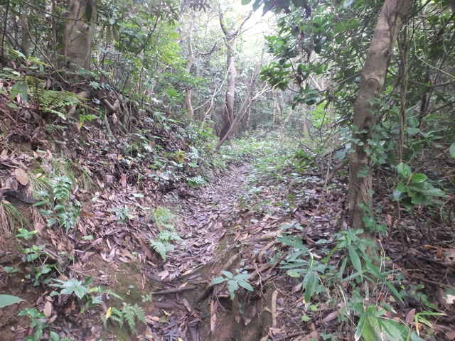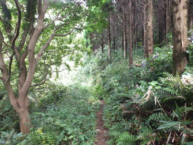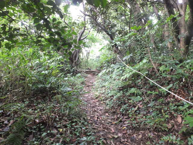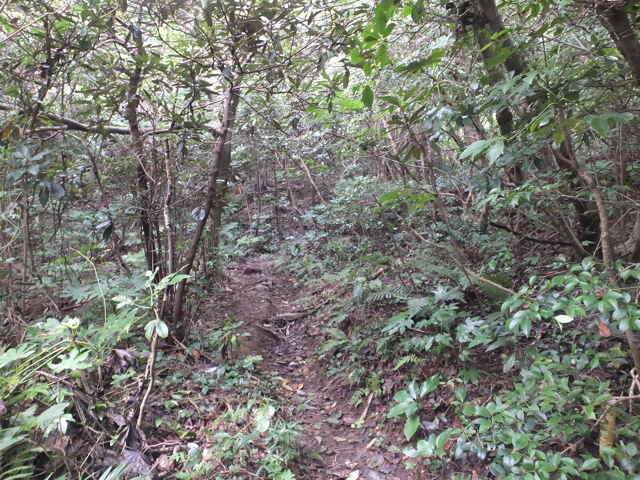 | 今日は手結へ行ったついでに、山を越えた海岸へのルートを確かめてみることにしました。港から民家の間の小路を上って行くと畑の中の径となって、左への分岐があります。灯台へ向かう径だろうと進んで見ますが、畑の奥で径は消えてしまいました。少し引き返して灯台方向を確かめると、踏み跡らしきものがありますが、草に覆われているので、今回は諦めました。分岐へ引き返し、小屋の脇を進むと、径は林の中に開いた穴のような入り江を下に見て回り込んで行きます。林内を上がっていくと、径は分岐し、直進は高西の岩場へ出るはずですが、笹が多くなって足元が見えないので、今回は諦めました。分岐へ帰り、右へ上がっていくと、やがてピークを越えると海が見えてきます。下りは狭い岩場の踏み跡をたどりますが、特に最後のところは、岩場の急斜面に足場が狭く、慎重に下がらないと、落下してしまいそうです。下った岩場がニタキです。 |