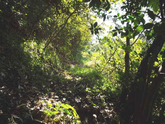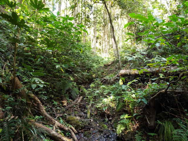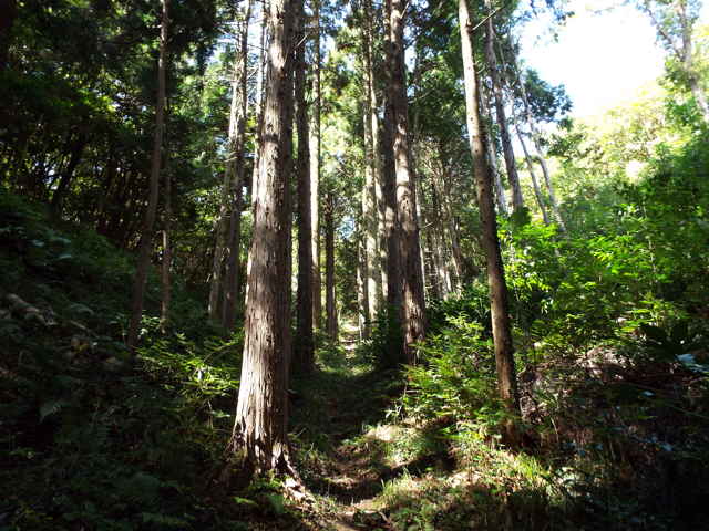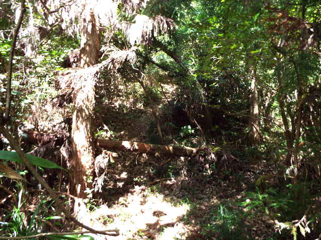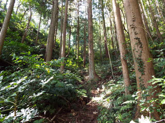 | 西生馬町 13:00 植林地の斜面を上がって行く。 | 13:02 小さな谷の中を上がって行く。 | 13:04 植林の中をまっすぐ上がる。 |