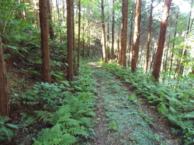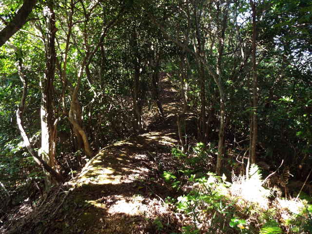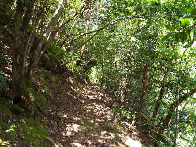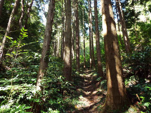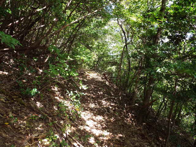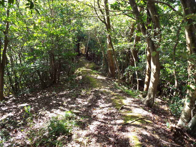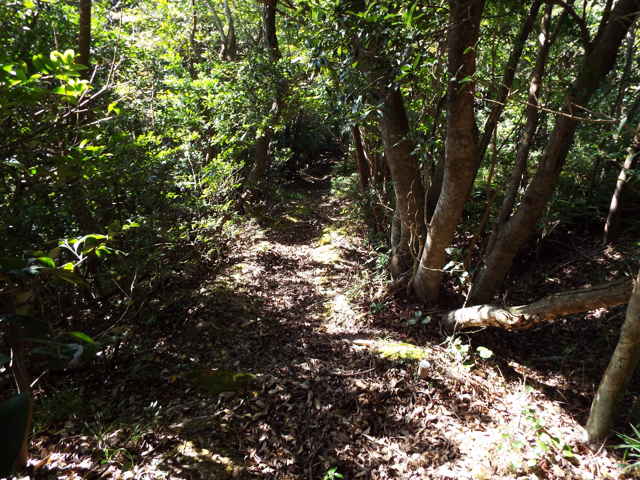 | 林道東西生馬線の鉄塔の下になる場所で巡視路を探すと、何か所か踏み跡が山へ入っていました。最初の2箇所はあまり管理された様子がなく、3番目を入ってみると、巡視路標識が立っていました。 小さな谷の中をまっすぐ上がると、植林の中を進み、植林地を抜けると傾斜がきつくなってきます。大きなヤマモモの木の脇を通り過ぎると、やがて径は平坦になり、また大きなヤマモモの木があり、その先に鹿島線鉄塔No.42がありました。鉄塔からは市街地や恵曇や日本海が見渡せました。 鉄塔の横から巡視路が伸びており、快適な尾根径が続いています。7分ほど尾根径を進むと、径が分岐しており、右の尾根を上がると三角点へ続いているようなので、上がって見ることにしました。少し上がると大きなヤマモモの木があり、ここからは恵曇方面や宍道湖が見渡せました。この場所は見晴らしが効くように木が伐採されているように思われました。ここからさらに7分ほど尾根を上がって行くと、小高くなったピークに四等三角点(小谷 190.92m)がありました。 分岐へ帰り尾根径を下がり、U字形になった径や細い尾根を過ぎると、小さな鞍部に下りてきます。径は直角に右へ曲がって斜面を下っていますが、地図を確認すると、鉄塔を過ぎているようでした。引き返して送電線を確認すると、枝葉の間に鉄塔が見え、木々の間に径が分岐していました。分岐から少し上がると鹿島線鉄塔No.43につきました。 鞍部に帰り右の斜面のV字形になった径を下がると、尾根径から植林地の脇へ出て、鹿島線鉄塔No.44へつきました。鉄塔のある尾根は伐採されており、朝日山や講武の平野やその先に日本海が見渡せました。 巡視路は尾根の先から斜面に下がって行き、また尾根径を下がっていきます。尾根は左へ曲がり、その先の伐採された尾根の先に鉄塔が見えました。鹿島線鉄塔No.45は、斜面の狭い場所に立っていました。 鉄塔の手前からは作業道が斜面を下っていて、3分ほど下がると、道路脇の斜面の上に石灯籠が1基あり、少し離れた道路脇には小さな石や祠が祀られていました。ここには寺とか神社とかがあった場所なのかもしれません。少し下がると、県道御津東生馬線に出てきました。 この巡視路は、歩きやすい尾根径が続き、鉄塔から展望もあるのでハイキングコースとして推薦できるルートだと感じました。 |
