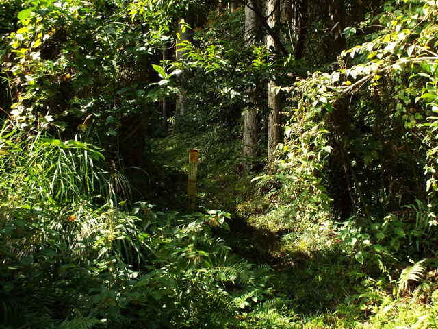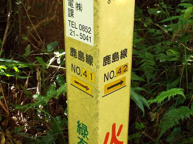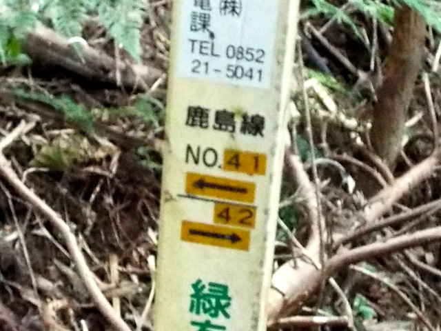 | 西生馬町 12:59 林道脇の斜面に踏み跡がある。 | 少し上に巡視路標識がある。 | 鉄塔No.42を指している。 |