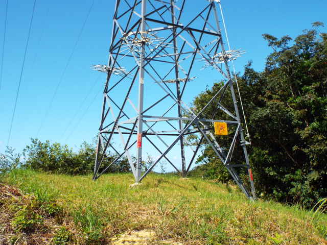 | 2020年9月28日に歩いた鹿島線鉄塔No.39の続きを歩いてみます。 林道東西生馬線の脇のガードレールが切れたところに小さな踏み跡が茂みに向かっていました。入ってみると径が続いており、巡視路のようですが標識はありませんでした。 巡視路へ入りすぐ急斜面を上がると法面の上に径がありました。道路沿いに進むと、径は直角に曲がり、左の斜面を上がっていました。太く背の高い笹に囲まれた斜面をまっすぐ上がると、鹿島線鉄塔No.40がありました。鉄塔からはNo.39やNo.41を見通すことができました。 鉄塔からは次の鉄塔No.41への巡視路は続いていませんでした。 |