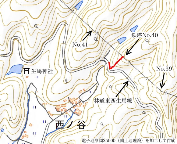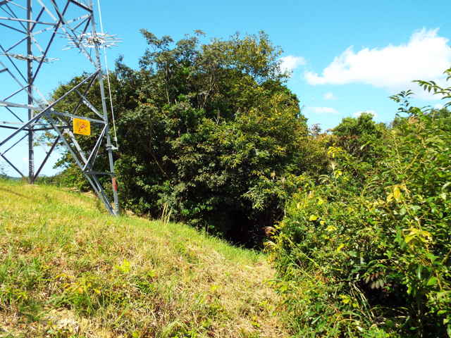 | 林道東西生馬線の道路脇を巡視路入り口がないかと探していると、広くなった荒地の脇に踏み跡が山へ向かっていました。ここにも巡視路標識はありませんでした。 巡視路を入ると倒木を越えて斜面を上がり、谷沿いの東斜面を上がって行きます。谷から尾根へ向かうと、鹿島線鉄塔No.41がありました。鉄塔からは先程の鉄塔No.40や遠くに市街地が見渡せました。 鉄塔の奥から巡視路が続いており、急斜面を下りています。斜面は超急斜面で、木々に掴まりながらというか、ぶら下がりながら下りていきました。やがて緩斜面になり、谷の中を下がって行くと、初めて巡視路標識がありました。標識の先は明るくなって、林道へ出てきました。入り口には巡視路標識はありませんでした。 |
