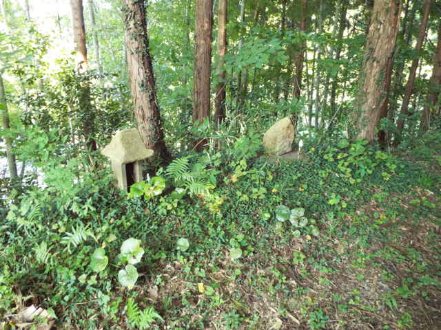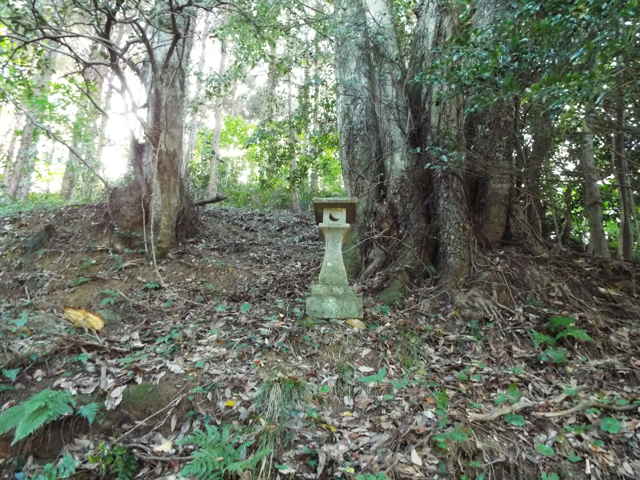 | 鹿島町 14:31 作業道を下がる。 | 14:32 法面の上に石灯籠がある。 | 14:33 径の脇に石や祠が祀られている。 |