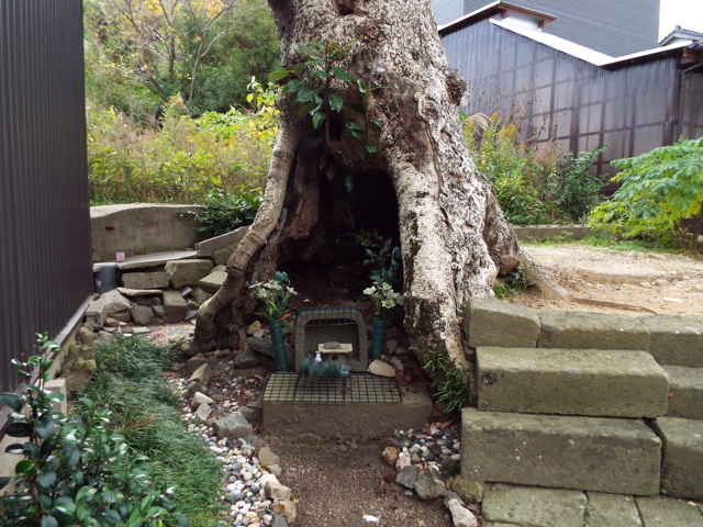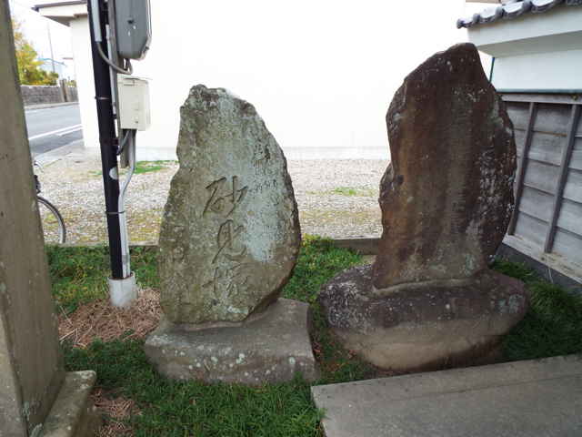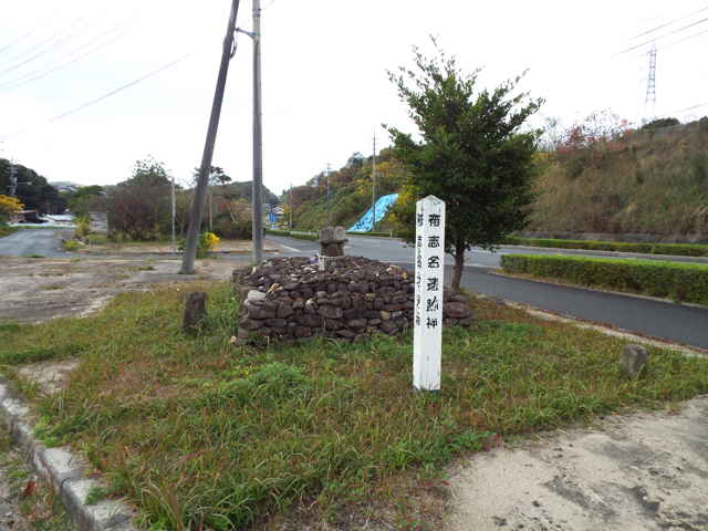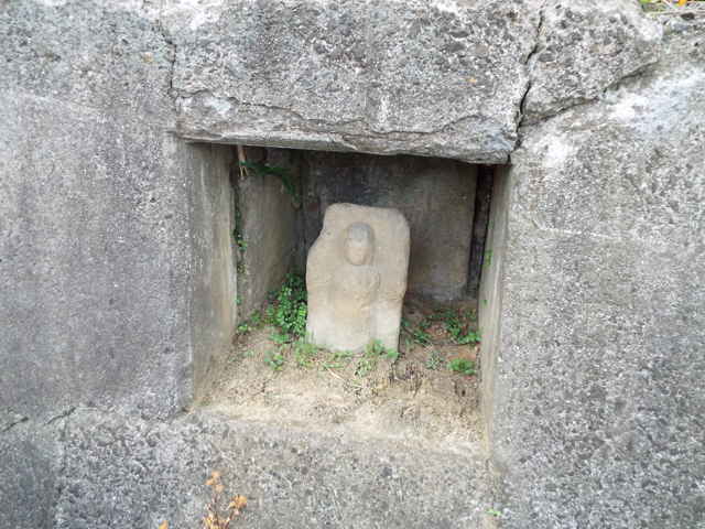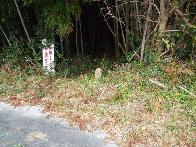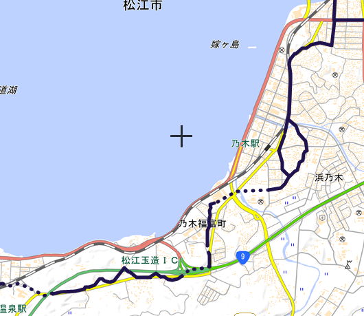 | 県道浜乃木湯町線は、山陰自動車道の高架下を抜けてすぐ直角に右折し、玉湯町布志名への峠を越えて行きます。改良前の県道は、右手の法面の上の自動車道の部分を通って、東廻池の端をまわって、現在の県道へつながっていたようです。橋を渡ったところで、旧道は左へ曲がって行きますが、その角に峠にあった塞の神が移転されていました。 左へ折れた旧道はすぐ県道へ合流します。県道から左へ入る路地があり、その奥に判官山と呼ばれる小さな丘があり、長い石段が上がっています。頂上には富士名氏旧蹟碑があり、その手前の少し下がった場所に後醍醐天皇の隠岐脱出を手助けした富士名判官義綱の古墓があります。また同所に小さな社があり、露出した古墳を祀ったような形になっています。 旧街道は判官山へ左折した付近から右へ張り出し、また左へ曲がって300mほど進む間は、その痕跡がありません。途中で左へ入ったところに、布志名焼雲寅窯がありますが、布志名焼は17世紀後半から始まったと言われています。また近くには明国寺があり、布志名氏の建立と言われています。 やがて県道から斜め右に小路が分かれ、自動車道の高架下を抜け、直角に曲がって南西へ向かっていきます。資料によると、この曲がり角に地蔵群があったと記されていますが、自動車道の橋脚工事によって失われてしまったようで、現在では見当たりません。 直角に曲がった道は山裾を進み、途中に2体の一丁地蔵があります。2つの山の鼻をまわると県道へ合流し、緩やかな坂を上がって樅ノ木堤の脇を通って、自動車道の仙石トンネルを抜けて行きます。旧県道(旧街道)は、堤の脇からトンネルの上部を越えて行ったと思われます。 トンネルを抜けて右へ曲がって行くと、竹やぶの脇に背を向けた石地蔵があります。石地蔵が向く竹やぶの中には踏み跡が中へ向かっています。石地蔵には「俵藤太」と刻まれていますが、いわれはわかりません。ただ石や刻まれた文字の風化具合からは、そんなに古いものではないようですが、旧街道の名残りなのかもしれません。 旧街道は玉造病院の敷地を通って、進入路の北側に沿って西進し、北側の線路を越えて旧県道へ合流していたということです。県道は2009年に改良され、トンネルを抜けた県道は病院の手前から南西に曲がり、山際を通って玉造へ入るようになりました。 |