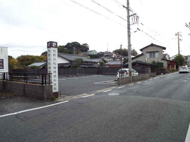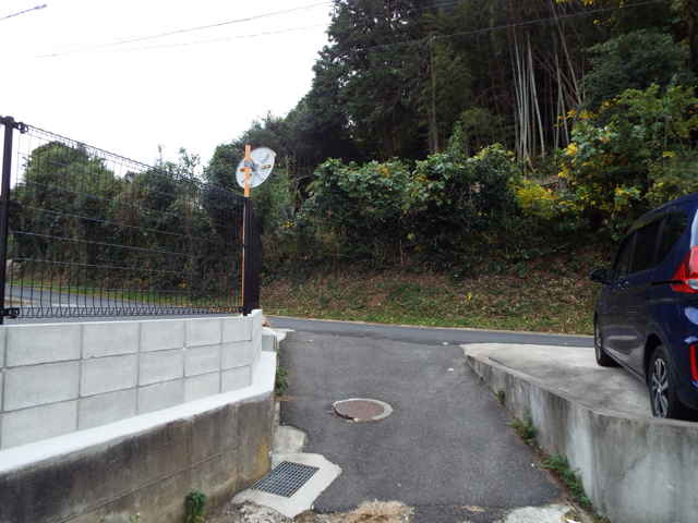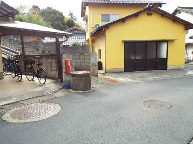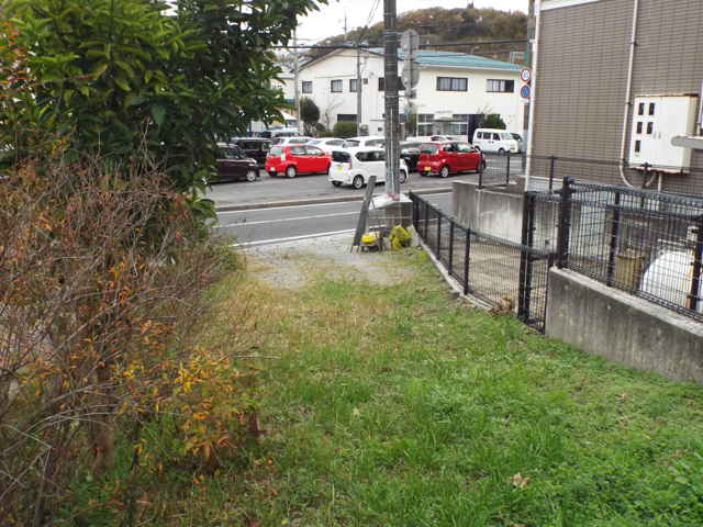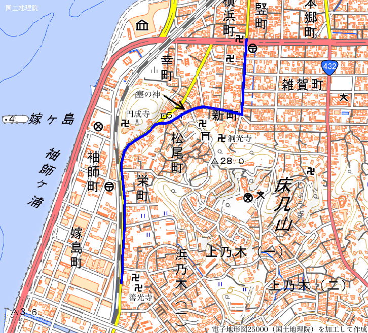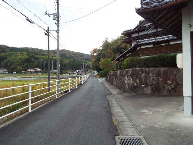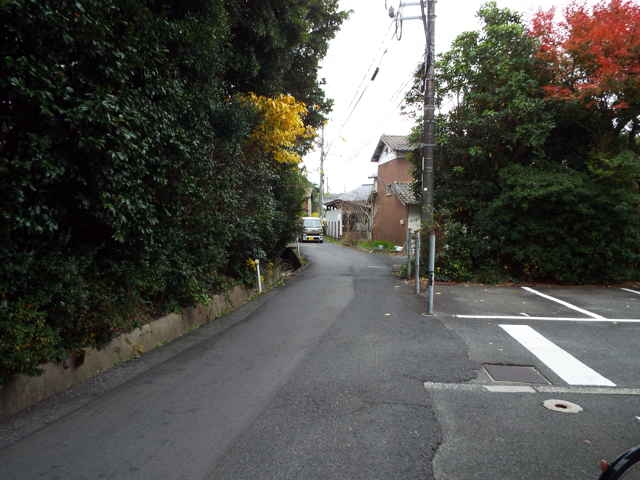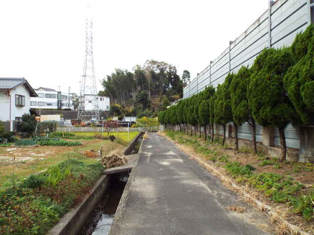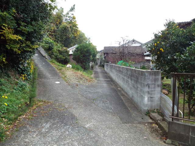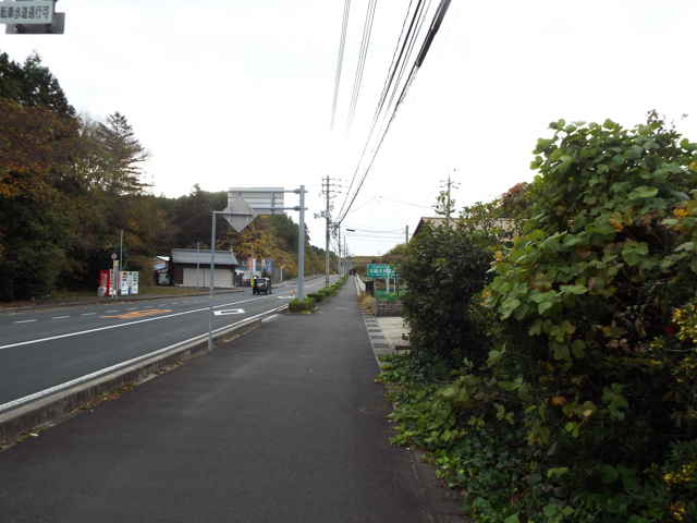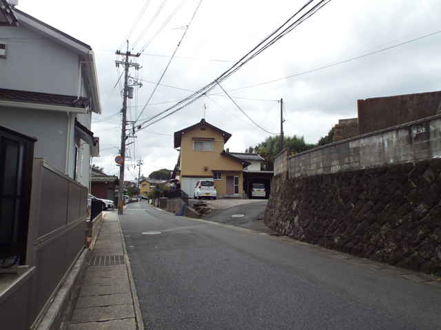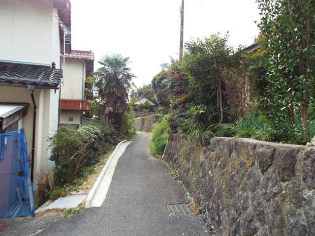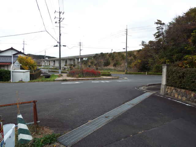 | 農林高校の運動場を横切った旧街道は、現在の忌部川にかかる半原橋より少し南側を渡ったそうです。橋を渡ったところの道路脇に地蔵像跡があったと資料にはありますが、ここら辺りは県道松江木次線の高架工事で新しい橋脚が立っており、昔の面影はありません。ただ橋脚のたもとに新しい石地蔵があり、これが以前の地蔵像跡を復元したものか、他の因縁によるものかはわかりません。 高架下を過ぎると、旧街道はパナソニックの敷地内を通って、敷地の西端の白龍大明神の前に出ていたということですが、今では道はありません。県道のパナソニック前を通り過ぎると、敷地に沿って細い道があり、フェンス内にある白龍大明神の前まで続いています。資料によると、白龍大明神は古い記録にはなく、会社が新しく祀り直したのではないかとしています。(パナソニックに確認すると、企業神社だということです。) 白龍大明神の前から細い道が続いており、これが旧街道になるようです。旧街道は、湖南テクノパークへの進入路を横切って、県道浜乃木湯町線の一段高いところを南に向かっています。舗装道路は途中で県道へ出ていますが、さらに無舗装の道、そして畑地のような空き地が続き、消防学校の手前で県道に合流しています。この県道へ合流する部分は市有地となっているので、そこへ連なっている民家の後の畑地のような場所も、道路跡かもしれません。 消防学校入り口の少し南の県道の右側擁壁に四角い穴が開けられ、一丁地蔵が祀られています。資料によると、県道の「坂道北山手の畑の中」にも地蔵像があるとされていますが、山陰自動車道の整備によって県道も移設され、今では探すこともできません。 現在の県道は山陰自動車道の高架下を抜けてすぐ直角に右折し、峠に向かっていますが、高架の手前の藪の中に舗装道路の跡が見られ、移設前の県道は自動車道に沿って峠に向かっていたようです。 |