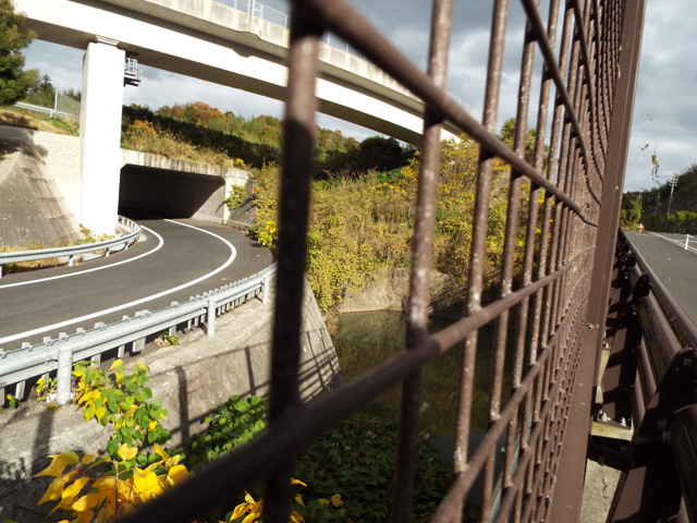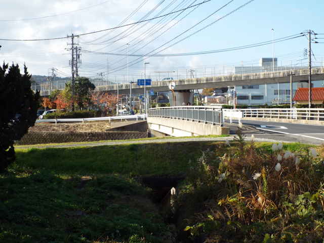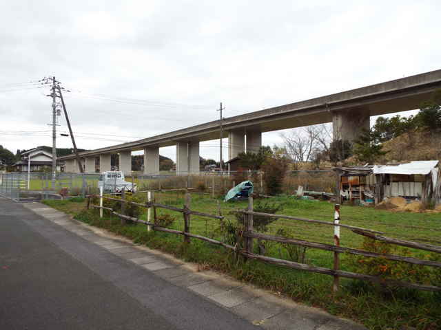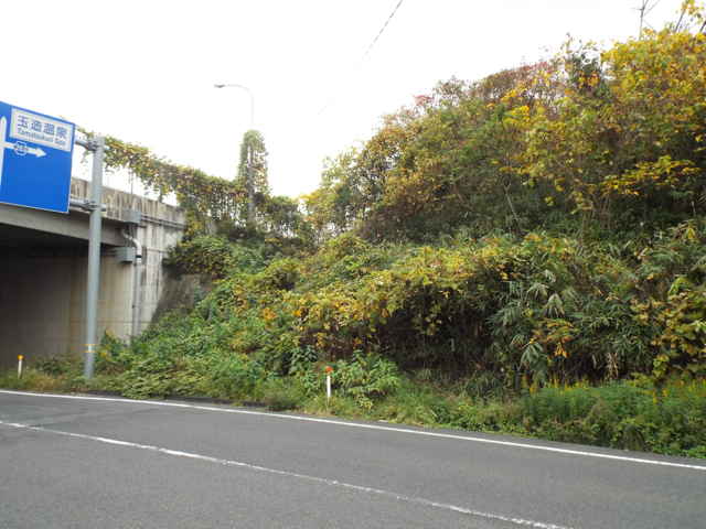 高架橋の手前の藪の中に旧県道の跡がある。 |