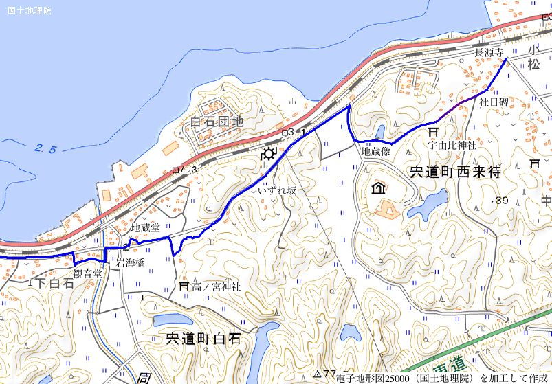 | 西来待の小松踏切を渡って南へ70mほど入ったところの長源寺の前へ、線路を越えた旧街道が水田の畦道を通って出てきます。長源寺の前から南西方向へ進みます。調査報告書によると、長源寺には天保11年建立の一畑灯籠があるとありますが、年号の刻まれた灯籠は、境内には平成9年に再建された天保10年と刻まれた石灯籠しか見当たりませんでした。 長源寺前から南西に向かっていくと、Y字の分岐の角に「天照大神」など5神の名を刻んだ社日碑が立っています。社日碑から直進すると林内へ向かっていきますが、その手前に鳥居が見えてきます。大国主神を祭神とし、出雲風土記にも記載のある宇由比神社です。猪野大明神とも呼ばれ、以前は伊野谷の西側に祀られていたようです。神社前から緩やかな坂道(明神坂)となって、峠を越えると伊野谷へ下りてきます。 南北に走る道と交差する右の角に、地蔵像が祀られていますが、元は少し北方の場所にあったものだそうです。ここから旧街道は谷を斜めに右の山の鼻に向かい、旧国道へ出たようですが、今では耕地整理のため道はなく、南北の道を北へ進んで、旧国道を左折して西へ向かいます。 白石へ向かう道は、もう一つのルートが考えられ、地蔵像から南へ400mほど進んで、山越えをしたルートが想定されるそうです。 山の鼻を周った旧街道は、来待変電所、白石配水ポンプ場の前から坂道(いずれ坂)になります。この坂道の峠が西来待と白石の境界になり、峠を下ると白石本郷となります。谷へ出たところからは、左の山際をたどり、山の西側から旧国道沿いにある児童公園の脇に向かっていたようです。児童公園の向かいには細い路地が北へ向かい、左へカーブして元の旧国道へ合流しています。このカーブのところに地蔵堂があり、石造りの双体地蔵像と木像の地蔵像がありました。 旧国道へ出た旧街道は、水田の中を斜めに同道川の岩海橋に向かったそうです。橋を渡ると正面の山の上に墓地があり、その登り口に六地蔵像と別の一体の地蔵像が立っています。 この同道川の谷には高ノ宮神社や石宮神社、古墳群などがあり、早い時期からの遺跡が多く残っています。 六地蔵から100mほど進むと、左の山手に観音堂があり、十一面観音が祀られているそうです。観音堂の前には地蔵菩薩1体、双体地蔵4基と小さな五輪塔1基が置かれています。 観音堂の少し手前から北へ向かって小路があり、旧国道と直交して20mほど畑の中を行き、線路沿いに西へ向かったそうです。西へ向かって150mほどで、再び旧国道に合流すると、すぐに旧白石村と宍道村の境界になります。 |