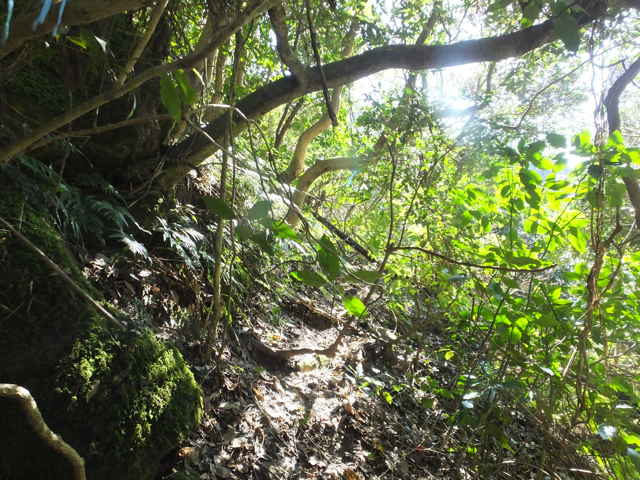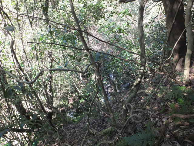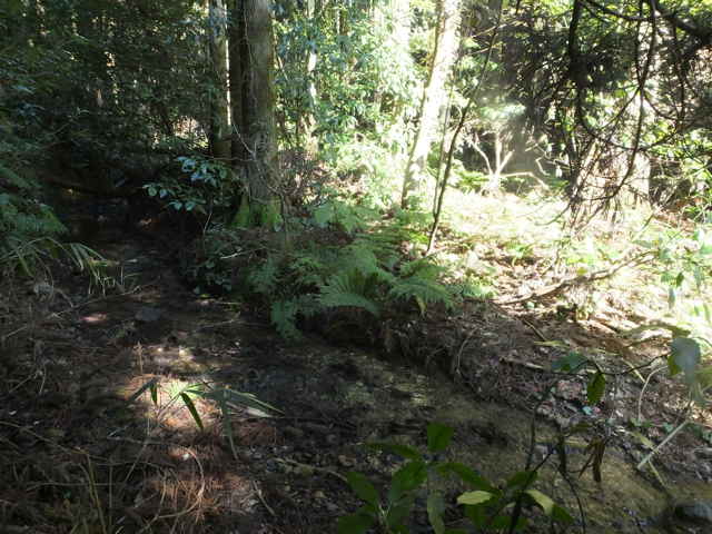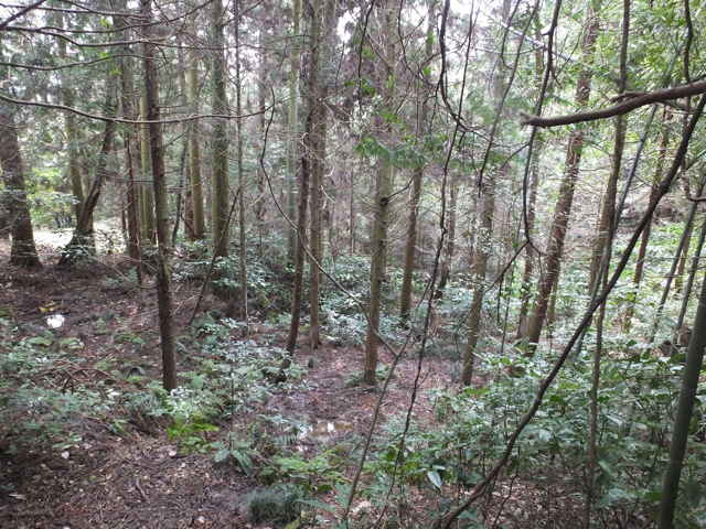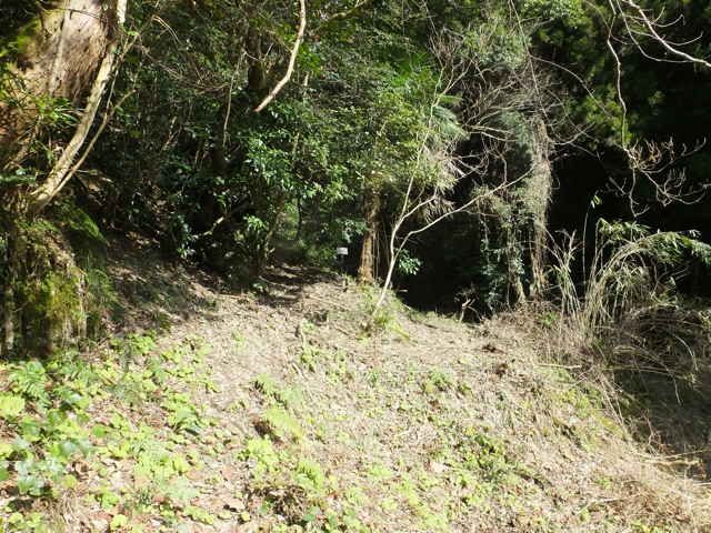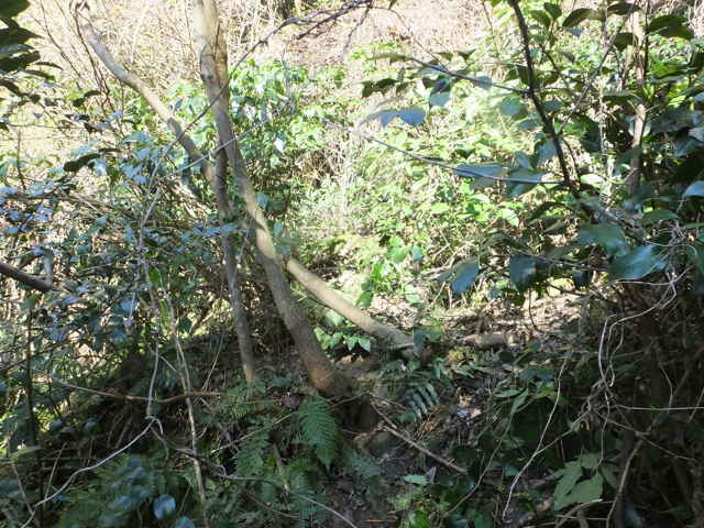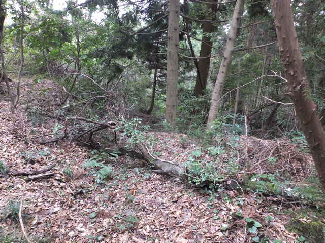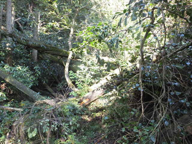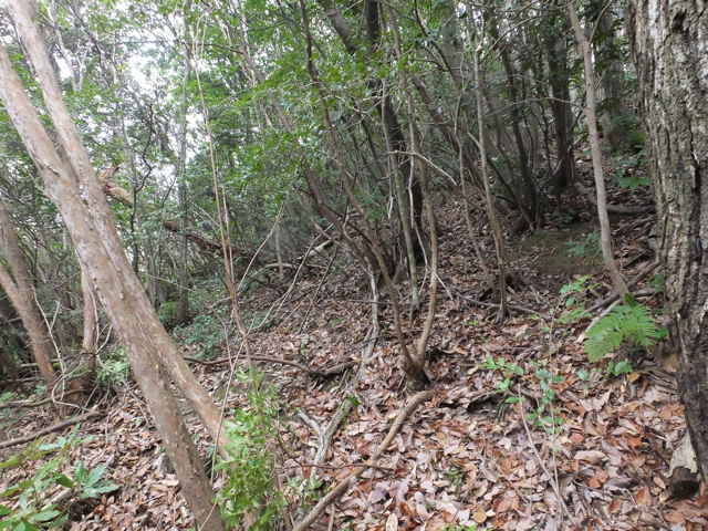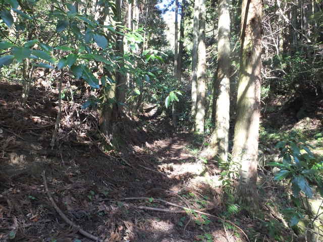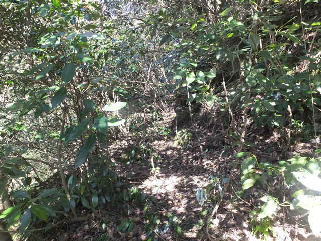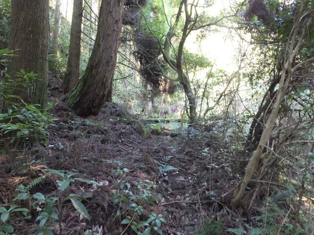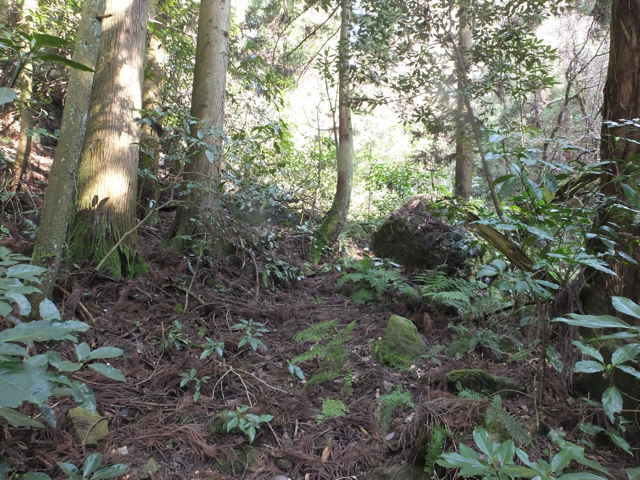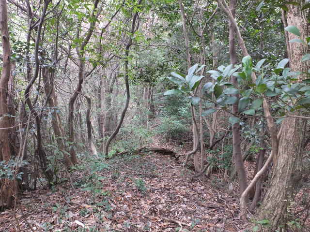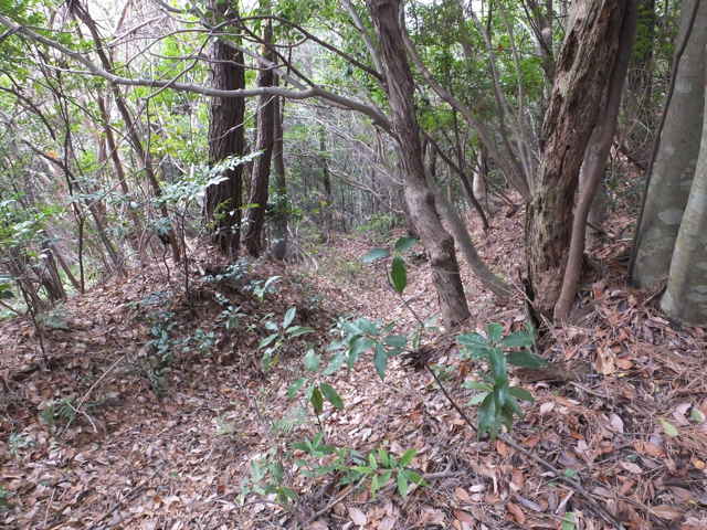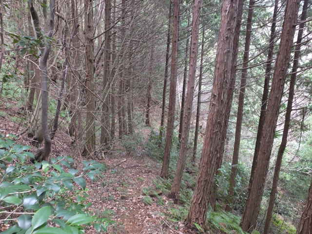 | 先日2月2日に澄水山旧道(仮称)を探して歩いた時に、林道澄水山線から斜面を上ったところに尾根径があったので、どこへ下りていくのか確かめることにしました。とりあえず、この径を納蔵東旧道(仮称)と呼ぶことにします。 林道澄水山線から斜面を上がると尾根にはっきりとした径がありますが、しばらく行くと正面の急斜面で径が消えてしまいます。踏み跡がないかと左へ回って見ますが、踏み跡は見つかりませんでした。やはり急斜面を上がるしかないようです。斜面を少し上がると尾根径があり、しばらく上部を探してみましたが、下りの分岐は見つかりませんでした。 元へ引き返し、尾根径を下がってみると、はっきりとした径が残っていました。ときどき倒木があったり、茨が枝を伸ばしているところもありますが、概ね歩きやすい径が続いています。 しばらく下がったところで、斜面に径が見えなくなり、方向を確かめて斜面を谷へ下がってみると、踏み跡があり、谷を上がっていました。踏み跡を遡ってみると、先程斜面を下がったところへ出て、枝を伸ばした木々の枝葉で径が隠れていたようです。ここを過ぎるとすぐに、納蔵東から林道澄水山線へ上がっている道に出会いました。 旧版地形図によると、ここから旧道は向かいの谷あいを下がっていくようですが、林内には耕作地の跡のような感じはありますが、踏み跡のようなものは見当たりませんでした。 |