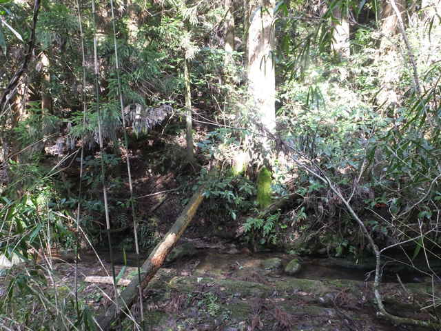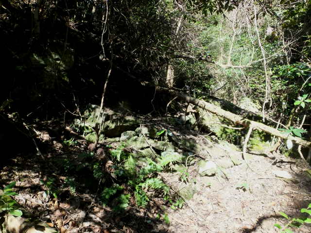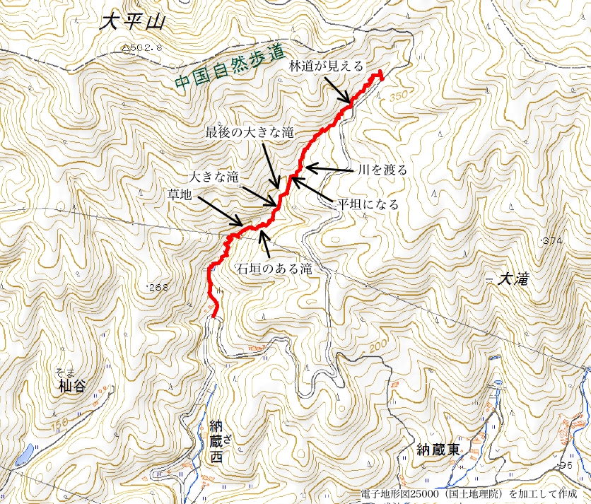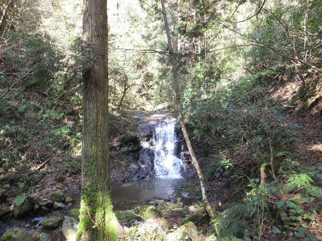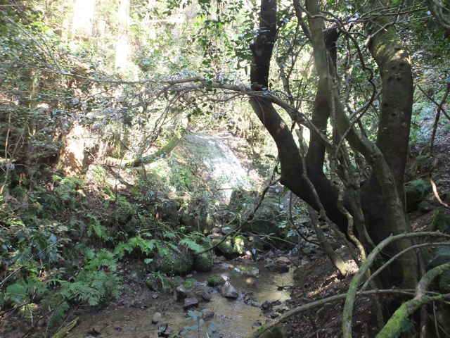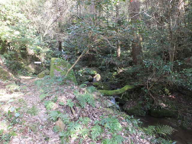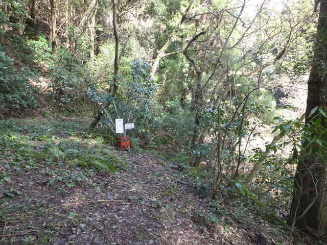 | 2月2日に行った大平滝の先から谷を上がっていく旧道を探して、再度谷へ向かいました。この旧版地形図にある旧道をとりあえず持田川旧道(仮称)と呼ぶことにします。 大平滝との分岐から5分ほど持田川を遡ると、開けた斜面の草地にでてきます。ここから川へ下りて行くような踏み跡のようなものもありますが、旧道は川に下りずに川の斜面を通ったようです。石積みのある滝の上部の径を過ぎ、川を渡ると大きな滝があります。その滝の脇を上がるように手前の斜面に径があったと思われますが、崩れているようです。崩れた斜面にロープを張ろうとしましたが、ロープを結ぶしっかりした木がなく、うまく張ることができませんでした。また次回に考えようと思います。 なんとか斜面をトラバースし、滝の上に上がると、径が続いていますが、川沿いには倒木があり、乗り越えて進みます。この先には更に大きな滝があり、急斜面の脇を上がることができないので、その手前から斜面を斜めに上る径があります。1段上がり、さらに1段上がると、はっきりした踏み跡が上へ続いています。 木々に隠れて川の様子は見えませんが、大きな滝の上部を過ぎたと思われるころで、斜面の径は藪の中に入ってしまいます。先日は少し枝を切りながら進んでみると、藪の中に踏み跡が続いているように見えました。本当にこの先に径が続いているのかと不安になりますが、さらに枝を切りながら数メートル進むと、藪を抜けて、踏み跡が見えてきました。踏み跡を進むと、長椅子のような長い大きな岩があり、その先は平坦な場所になり細くなった川と出会います。急な山径を上がった村人が、休憩場所として使っていたのではないかと思われるような場所です。 川に出会った場所から林内に踏み跡が見えませんが、川沿いに上がっていくと、石が一列に並んだ場所があり、なんとなく径の跡のような感じもします。その先は川へ繋がっており、川を渡ると、川沿いの林内に踏み跡が上がっていました。しばらく上がると、正面に大きな岩があり、川へ下りても急斜面で通れそうにありません。引き返すと、左の斜面を上がっていく踏み跡が見えました。斜面の細い径を抜けると、植林の林の向こうに、林道澄水山線の白いガードレールが見えました。 しばらく川沿いの林内に踏み跡が見えますが、やがて踏み跡は見えなくなり、谷が2つに分かれます。旧版地形図を見ると、左の谷を上がって行くようですが、時間的にも体力的にも今日はここまでとし、右手の急斜面から林道澄水山線へ上がり終わりとしました。 |