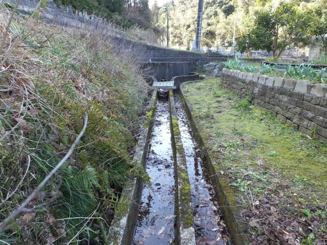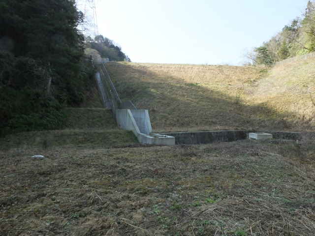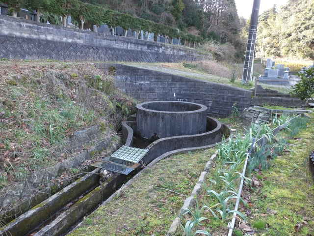 | 2019年3月25日に見た矢田町の円筒分水施設について、東出雲町春日に同様の分水施設があるという情報を得たので、湯谷池を訪れてみました。 湯谷池の谷に入って、堤塘の下の水路を探しても、分水施設は見つかりませんでした。もう壊されてしまったのかとも考えましたが、少し水路の流末を探して見ることにしました。谷を下がって、春日トンネル入口の近くにある墓地の入口に円形の施設が見えました。ここの円筒分水は3つの水路に用水を分けていました。 この円筒分水は、円筒分水のことで紹介されています。 |