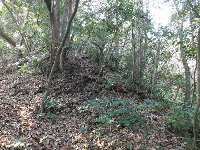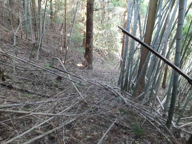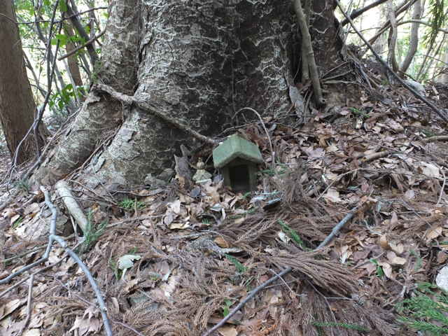 少し下がったところに谷があり、電柱が並んで上がっています。径がないかと谷を少し入ると、左の竹林の脇に踏み跡があるように見え、道路に戻ってみると、竹林の脇から踏み跡が上がっていました。踏み跡から入ってみると、溜池へ上がるような径で、溜池の土手に上がって、土手を右へ谷の中央に向かいますが、踏み跡のようなものは見えません。少し上がると、平坦な場所に上がり、どうも広い道があるようで、右の竹林の中へ下がっているようでした。径はどこから上がっているのかと下がって見ると、谷の一段下を横切り、溜池の上部から柿畑の脇を通って道路に下りていました。 この広い径が旧道ではないかと再度上がって見ますが、随所で枯竹が倒れ込んでいます。枯竹をなんとか踏み越え、潜りながら上がってみましたが、ついに幾重にも倒れ込んだ枯竹で進めなくなってしまいました。電柱のある谷へ引き返し、尾根に上がろうと思いましたが、谷は急傾斜で、こんなところを旧道が上がっているとは思えませんでした。上がれそうな場所はないかと少し竹林内を下がってみると、竹林内にわずかに踏み跡のようなものがあり、尾根に向かっても、なんとか上がれる緩斜面になっています。斜面を少し上がると、尾根にある星上山の登山道に出会いました。上がった尾根にある大きな木の根元に、高さ10cmほどの小さな石の祠が置いてありましたが、中は空でした。側には小さな男雛のようなものもあり、ここはなにか意味のある場所だったようで, 多分旧道の峠ではなかったかと思われます。 また機会があれば、竹林内の広い径の行き先や旧岩坂越えのルートなどを確認してみたいと思います。 |