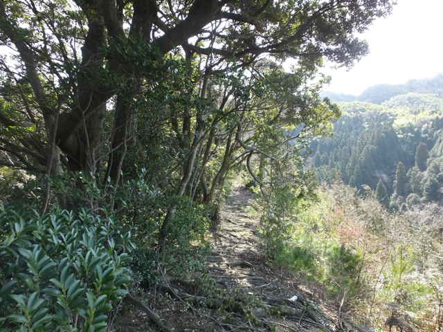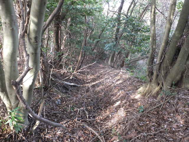 | 2019年5月25日に一度上がったが星上峠の手前の藪で引き返した径へ再度向かってみました。 宍道湖南部広域農道から林道須田・大谷線を入り、耕地に沿って谷を奥へ向かって上がっていきます。耕地を過ぎ林内に入ると左手に作業小屋があり、その先で橋を渡って、さらに谷を上がっていきます。林道の分岐があり、左へ橋を渡り上がっていくと、ぬかるんだ径がしばらく続き、その先で林道が分岐します。左へと斜面をあがって行くと、目の前に星上山系が見えてきて、目指す星上峠も見えてきます。どこまでが林道須田・大谷線なのかわかりませんが、しばらく上がると林道は終わり、その先の林内に尾根径が続いています。 尾根径を少し進むと、先が藪となってきて、その先にも踏み跡があるような感じにも見えますが、ルートは右の斜面に折れて、急斜面を上がって尾根径に上がります。 尾根径を少し上がると、ピークに向かう径と、左へ折れて斜面をトラバースする径とに分かれます。斜面をトラバースする径は、急斜面の非常に狭い踏み跡なので、非常に緊張します。斜面を過ぎるとすぐに尾根径へ出てきます。ピークを上がるルートを確かめようと、斜面の径を分岐まで引き返し、急斜面をピークへ向かいました。急斜面は枯れ葉に足が滑りますが、木々につかまって上がれるので、斜面の狭い径よりは、安心できます。ピークから急斜面を下がると、先程の斜面からの径が尾根径へ出会った場所に下りてきました。ここまで来ると、目指す星上峠の上にあるアンテナが見えてきます。 尾根径を進んでいると、左へ入る踏み跡があり、たどってみると斜面を後方へ向かって伸びています。やがて径は谷へ下りて行くようなので、引き返しましたが、市ノ原に向かって下りていると思われます。 元へ引き返して、林内の径に入ると、一基の石地蔵がありました。昔は星上寺への参拝ルートとしても使われたと思われるので、一丁地蔵なのかも知れません。ここからしばらくの林内の径は、U字形になった径が上がっており、旧道の名残りが感じられる径です。 石地蔵から15分ほど上がると、木々の向こうに星上峠の下にある小さなアンテナが見えてきます。林を抜けると、笹薮が広がっていますが、その中になんとなく踏み跡が見えています。この笹薮の手前に左へと踏み跡があり、藪が深く通れそうもありませんが、萱野地区へ向かう旧道があったと思われます。 去年はナタを持ってきていなかったので、ここでイバラの藪に拒まれて、引き換えしています。今回はナタを持ってきたので、ノイバラやサルトリイバラ、タラノキを払いながら進みましたが、あちこちでひっかかるので、手は傷だらけになってしまいました。15分ほど藪と格闘し、やっとアンテナ脇の芝地に出て、星上峠まで上がることができました。 |
