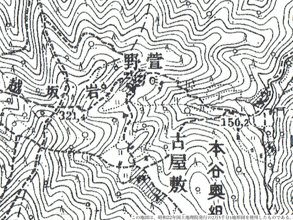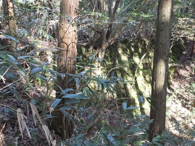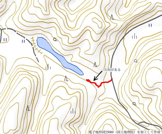| 昭和22年発行の旧版地形図を見ると、東出雲町須田から谷沿いに八雲町に抜ける径が描かれています。谷を入っていくと、奥に石垣がありますが、なんの為の石垣か不明です。この奥は八雲町にある溜池の上部になり、湿地になっています。湿地の左側に、わずかに藪の中に踏み跡があり、また古いテープがあったり、枝を切った跡がありますが、やがて藪が深くなり、今回は他に目的もあるので諦めました。 |