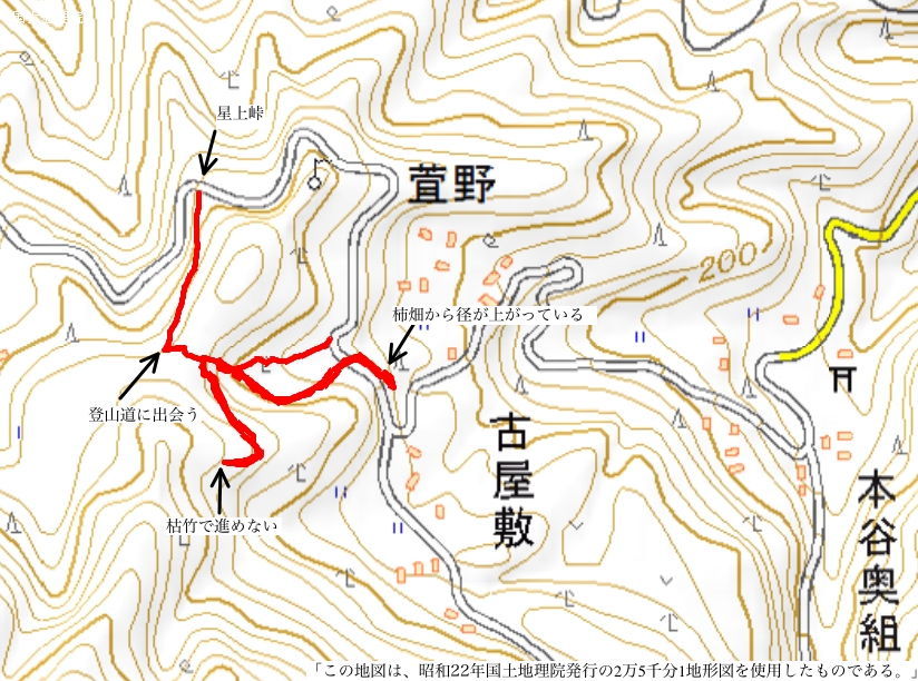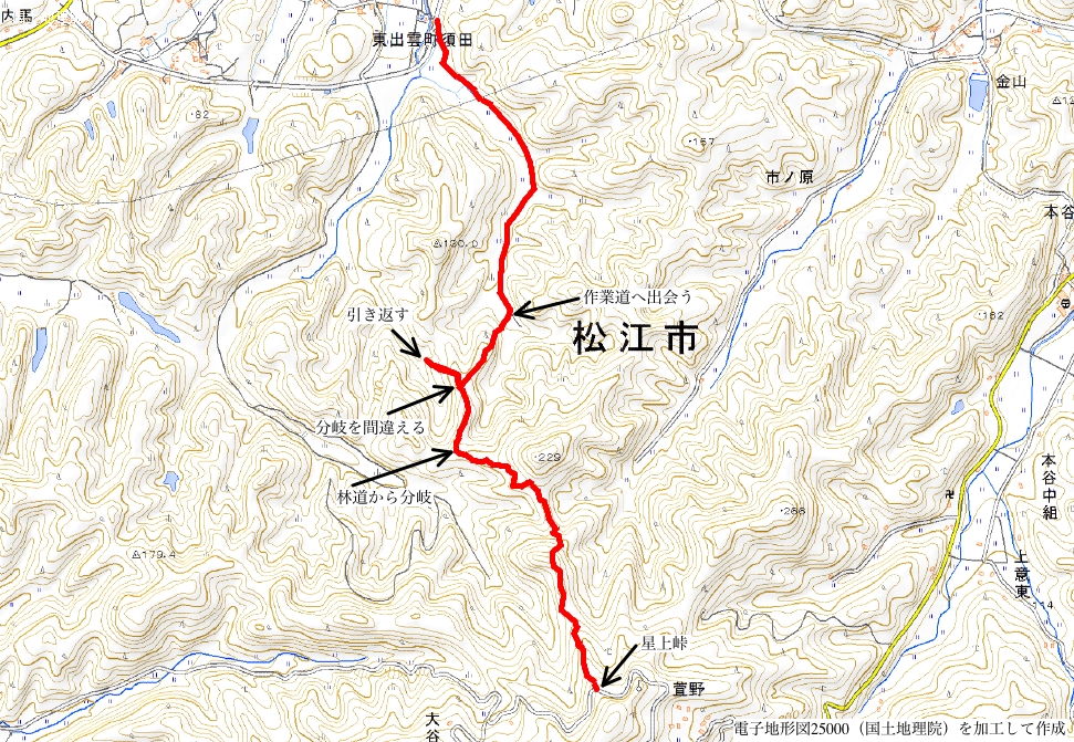 | 昭和22年発行の旧版地形図を見ると、東出雲町須田から谷を上がって星上山へと旧道があります。午前中に林道須田・大谷線から谷を上がって星上峠まで上がりましたが、途中からはこの旧道と重なっています。星上峠からの帰りには、東隣りの谷からの旧道を探してみることにしました。 旧版地形図を頼りに、林道からそれらしき尾根に上がってみると、北へ向かった尾根に踏み跡が続いていました。はっきりした径が続き、10分ほど下がったところから、径なりに下がって行き、場所を確認すると、間違った谷を下りていることに気が付きました。 間違って直進した場所まで引き返すと、分岐部分がはっきりしませんが、右の尾根に向かって踏み跡が続いていました。10分ほど尾根径から斜面の径へと下がっていくと、前方が開けてきて、畑の脇へと出てきました。この畑には谷を上がってくる作業道があり、以前にも何度か来たことのある場所でした。 畑から作業道を下がっていくと、15分ほどで宍道湖南部広域農道へ出会いますが、以前は川の流れとともに途中から反対側の山際を通っていたようですが、今は耕地整理によって真っ直ぐな道になっています。旧道はここから |