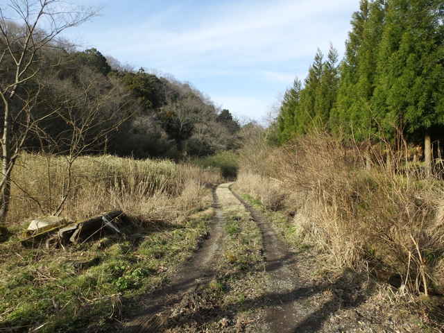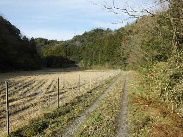 径は見えないが電柱の並ぶ谷を上がる。 |