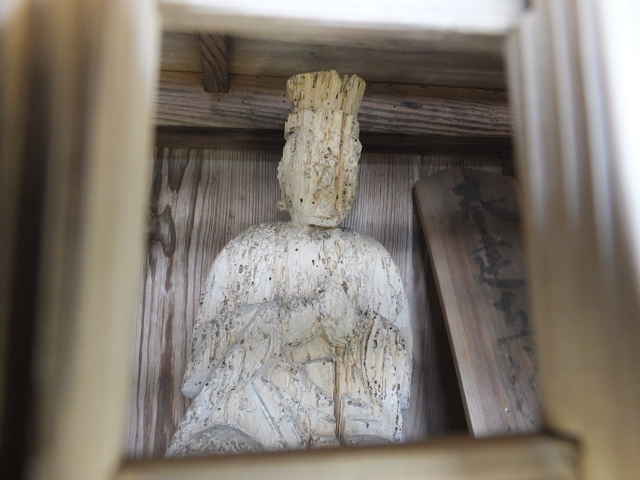 古い木彫の仏像があった。 | 12:12 最後の建物の前を行く。 | 12:16 溜池の横を過ぎる。 |