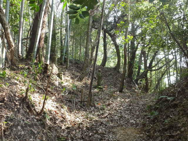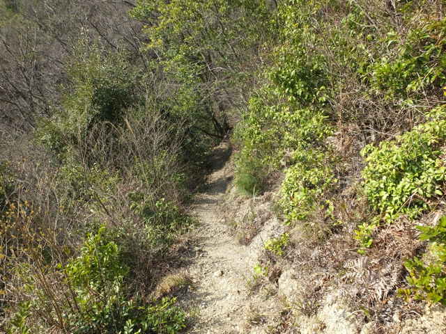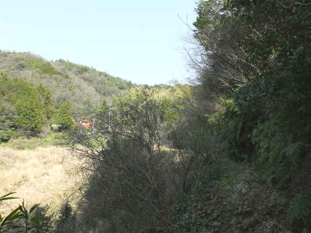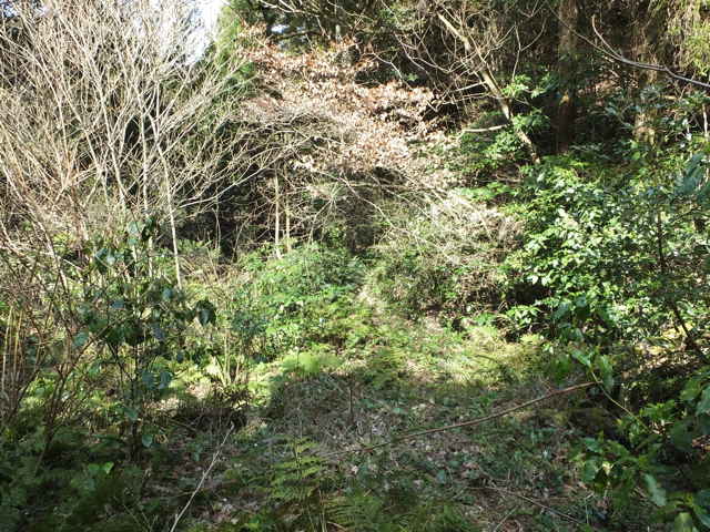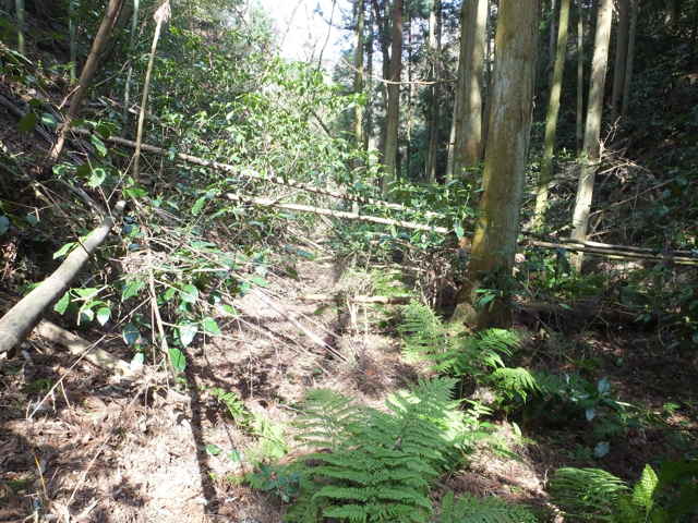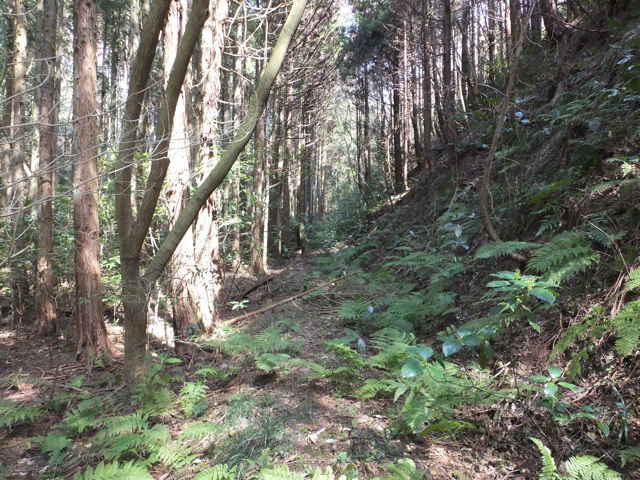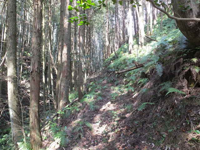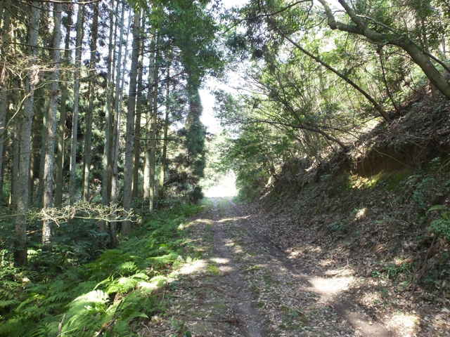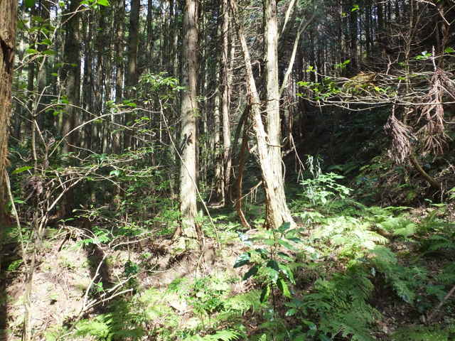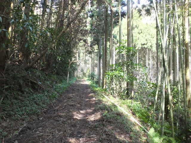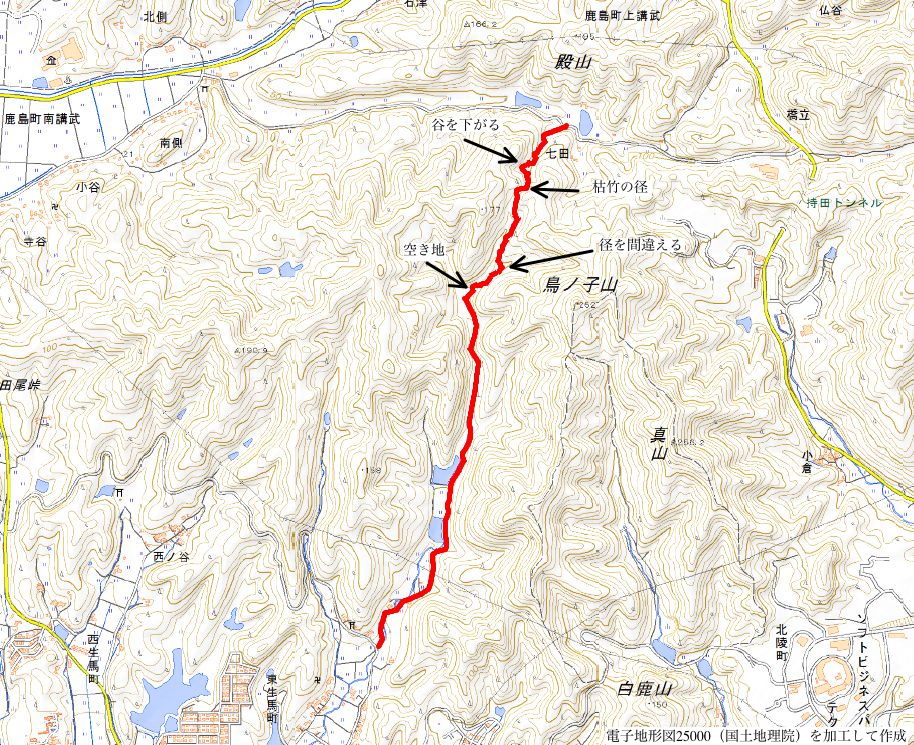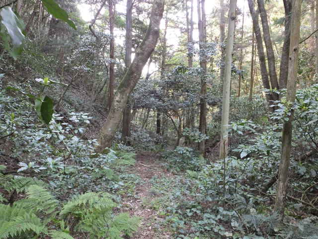 | 古い地形図を見ると、東生馬町から鹿島町上講武へ山を越える径があるので、確かめてみることにしました。谷を入って溜池を越えた鳥ノ子山の麓あたりまでは作業道があって、以前に行ったことがありますが、その先は藪になっていたような記憶があります。鹿島町へ山越えできた場合、同じ径を引き返すのも気がすすまないので、なるべく短距離で帰れるようなルートを探しました。地形図やグーグルマップを見ると、白鹿山の麓の林道真山線から鉄塔巡視路が山を越えているようなので、持田トンネルを越えて、白鹿山の麓から鉄塔巡視路を通って東生馬町へ山を越えるルートが最短距離のようです。 東生馬町の生馬神社の参道前から北へ向かって谷を上がっていくと、道路脇に小さな社があります。4本の柱を伸ばした上に社が載っています。中には古い木彫の仏像が置かれていました。少し進むと山際に家がありますが、現在は廃屋のようです。家の後ろに鉄塔の巡視路の標識があり、林道真山線からの巡視路がここへ下りてくるのだろうと思われます。 2つの溜池の横を通ると、舗装道路は終わり、未舗装の作業道が植林地を入っていきます。最後の溜池から10分ほど進むと、開けた空き地に出てきます。ここで作業道は終わり、径らしきものは見えなくなってしまいます。空き地の奥へ入って、周りを見渡すと、右の山際に径のようなものが見えましたが、空き地からは藪になっています。 藪の笹をかき分けてみると、水路の土手に踏み跡が続いているように思われました。枝を切りながら進むと、確かに踏み跡が林内へ向かっているようでした。林内へ入ると、踏み跡は見えなくなりますが、水路に沿って上がっていくと、山際にはっきりした径がありました。5分ほど林内を進むと、踏み跡が直進と、左へと分岐していました。直進すると踏み跡が不明になるので、地図で想定のルートを確認すると、間違えていることがわかりました。先程の分岐を、左折するのが正しいようです。 分岐へ引き返し、谷を渡って行くと、斜面にはっきりとした径が伸びていました。 斜面を周った径は、さらに左へ尾根を巻いて上がっていきます。径は細く、時々シダが伸びて足元が見えにくくなりますが、はっきりとした踏み跡が上がっていました。やがて峠らしいところまで上がると、踏み跡は左右に分かれ、右は小さく切り通しのようになって下がっていますが、枯竹が倒れ込んでいました。この先、進めるのかと不安にもなりますが、行けるところまで行こうと進みました。 枯竹は倒れ込んで行く手を塞いでいますが、古い枯竹のようで、すぐに折れるので、なんとか進むことができました。これが本当に径なのかとも思われましたが、枯竹の下にあるのは径のように見えます。斜面の径の枯竹はしばらく続き、20分ほど枯竹と格闘すると、やっと竹藪を抜け出すことができました。 尾根を巻いた斜面の径の竹藪を抜けると小さな谷に出会いました。その先の斜面に径は見えず、位置からしてもここから谷を下るようです。谷を下がると、広い谷に下り、踏み跡らしものが下がっています。 径は少し荒れていますが、はっきりした踏み跡が続いていました。10分ほど下がると、きれいに手入れされた径になり、その先に民家が見えてきました。2時間弱で鹿島町上講武の市道へ出てくることができました。 |