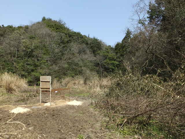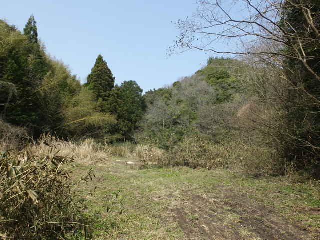| 12:30 作業道の先が明るくなる。 | 12:31 開けた空き地に出る。 | 12:33 径を探すと、右の山際に径が見える。 |