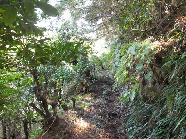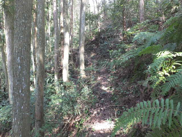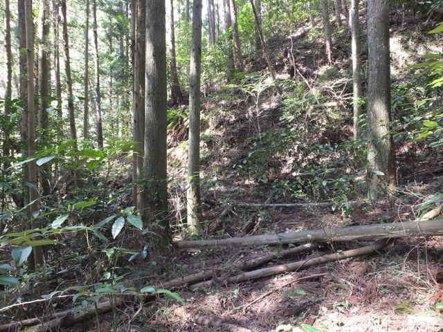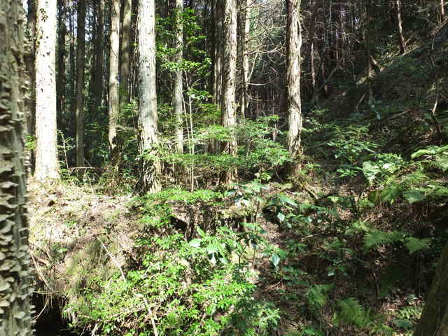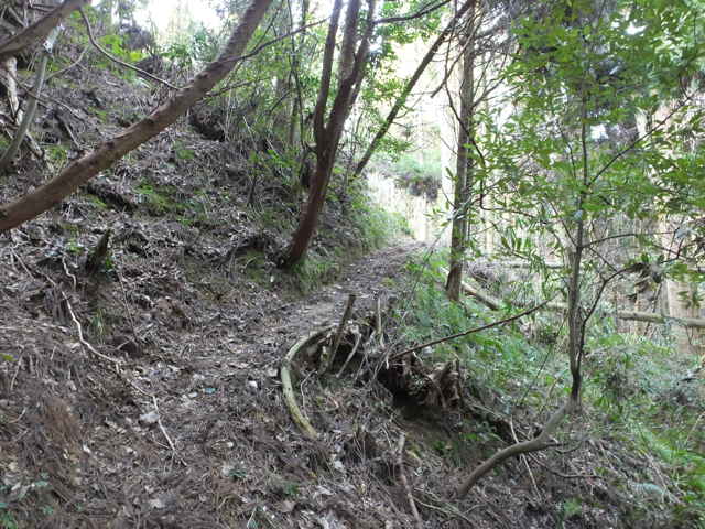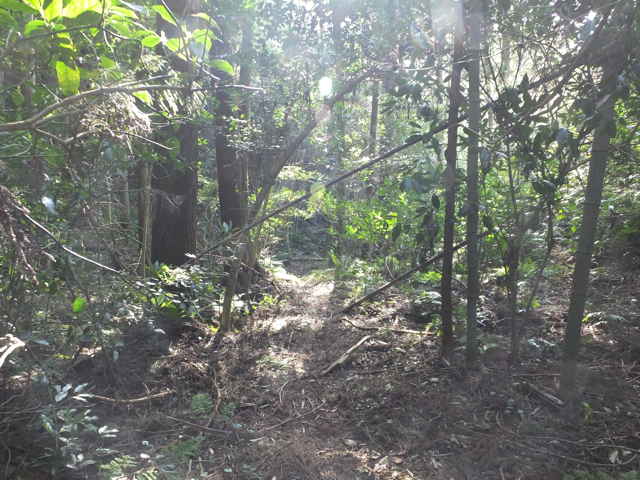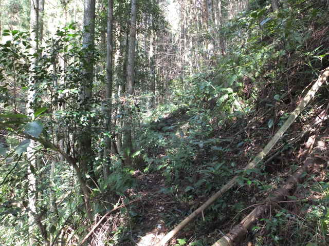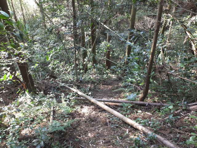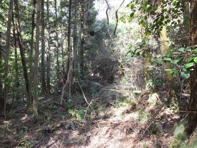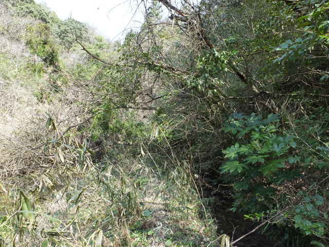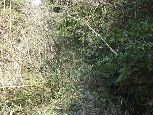 | 13:41 やっと竹林を抜け出した。 | 13:44 谷に出会い、谷をを下る。 | 13:50 荒れているが径がある。 |