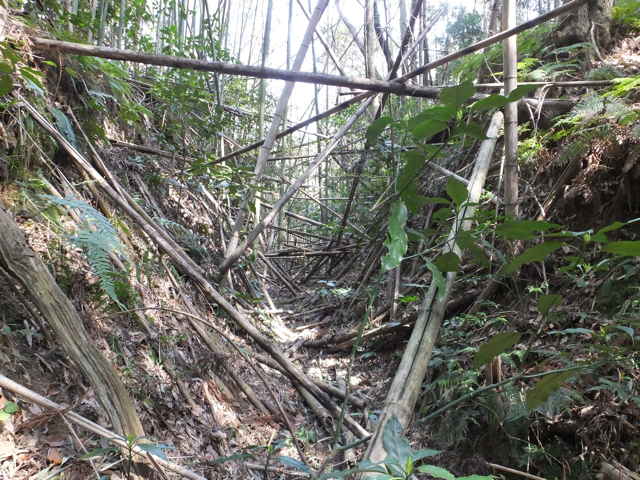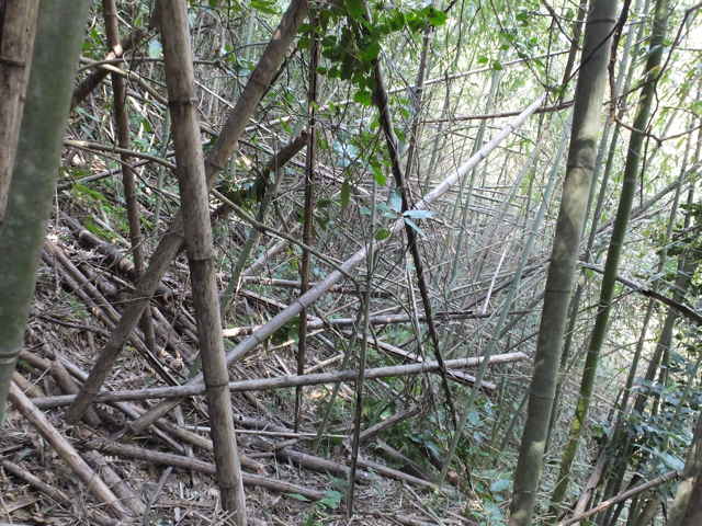 | 鹿島町 13:22 枯竹が重なり合っている。 | 13:29 斜面の径に枯竹が倒れ込んでいる。 | 13:36 枯竹がまだ続く。 |