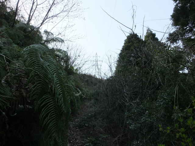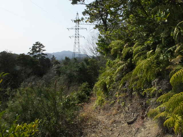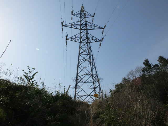 | 上講武へ出たところから出発点の東生馬まで帰るためには、大きく山を周らなければ道がありません。持田トンネルを通って、西持田町小倉から小倉寺跡への峠を越えて、ソフトビジネスパーク、林道真山線と歩いて、白鹿山の麓から鉄塔の巡視路へ入り、山を越えることにしました。 林道真山線のカーブに巡視路入り口の標識があり、急斜面をつづら折れに上がると鉄塔につきます。鳥ノ子山への登山道が上に伸びていますが、鉄塔の下からまっすぐ巡視路をたどって、次の鉄塔まで歩き、ここから急斜面を下ると、東生馬町の谷へ下りてきました。 想定していた巡視路は、もう一つの鉄塔を経由して、民家の後ろへ出てくるはずでしたが、どこかで鉄塔へ向かう巡視路から外れて谷へ下りてしまい、民家の横に下りてきました。(後で確認すると、間違いではなく、次の鉄塔No.36は民家の後の巡視路を上がっています。) |