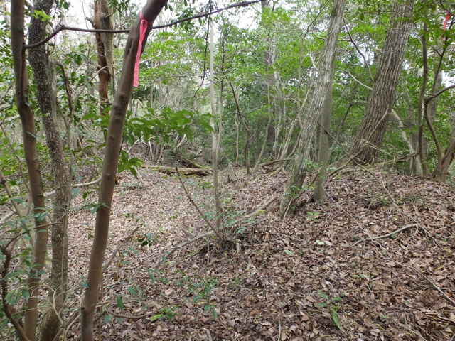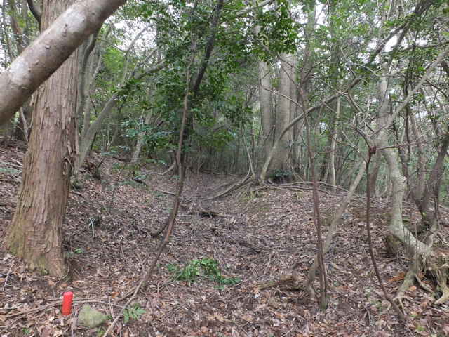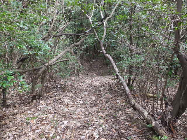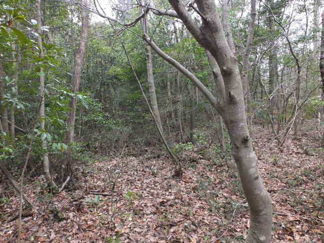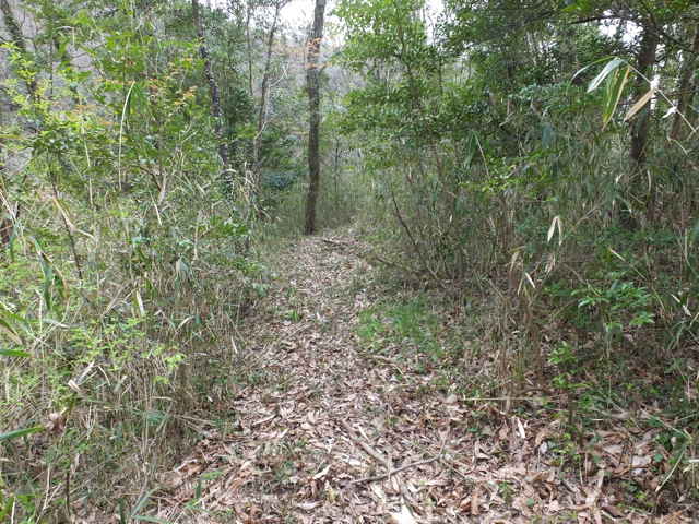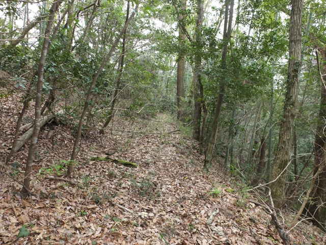 | 旧道へ分岐(16:19の位置)したところまで帰り、そこから旧版地形図にあるように、下部へ向かって尾根を下がってみました。 尾根には踏み跡が見えないので、若干ルートが違っているのかもしれませんが、現在の三叉路に下りてきました。 |