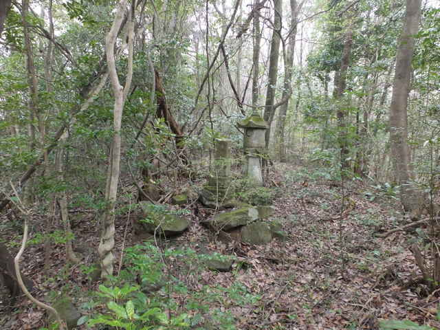 | 空中写真に見える旧道を西へ向かった途中で、分岐のあった場所(14:13の位置)を左折するのが、旧版地形図にある旧道と思われます。 分岐からしばらくは竹林の中に踏み跡らしきものが続きますが、前方が急な斜面になると踏み跡が不明になってきます。尾根に向かって上がっていくと、また踏み跡があり、すぐ鉄塔巡視路に出会います。 しばらく鉄塔巡視路を行くと、鉄塔No.10への分岐を過ぎ、左手に鉄塔No.9を見て進んでいくと、巡視路は左へ分岐しますが、旧道は直進します。 分岐から、なだらかな尾根径を20分ほど上がると、1つ目のピークに着きます。旧版地形図には旧道は神社に向かった径のように描かれていますが、途中に神社があったような形跡は見当たりませんでした。(後日、地域の方の話として「神社は、麓の日野目天神社の境内に遷したので、元の場所には何もない。」とのことでした。比婆山(久米)神社) ピークを少し過ぎたところに石灯籠があり、傍らに「一畑薬師如来」と刻まれた石柱が立てられていました。石灯籠には「文政十三年奉寄進」と刻まれているように見えました。 次のピークへは踏み跡は不明で、やや荒れた状態で、ピークも藪になっていました。 旧版地形図にある旧道が向かった神社は確認できませんでしたが、径はさらにピークの石灯籠まで続いており、一畑薬師信仰による参道ではなかったかと思われました。 |