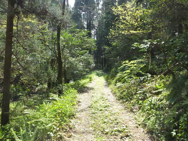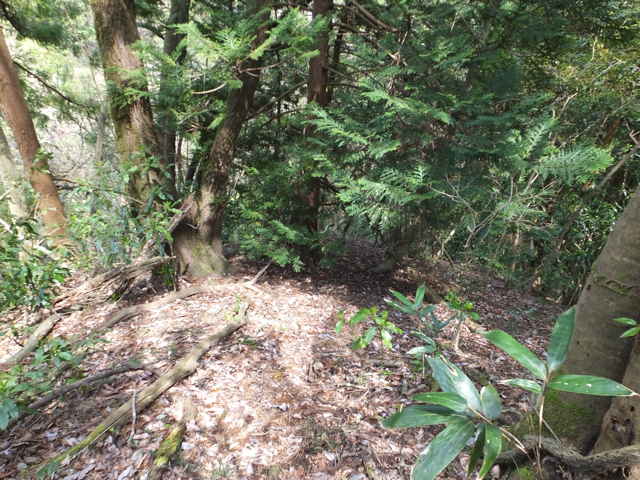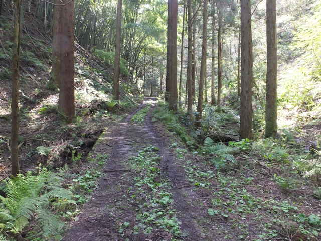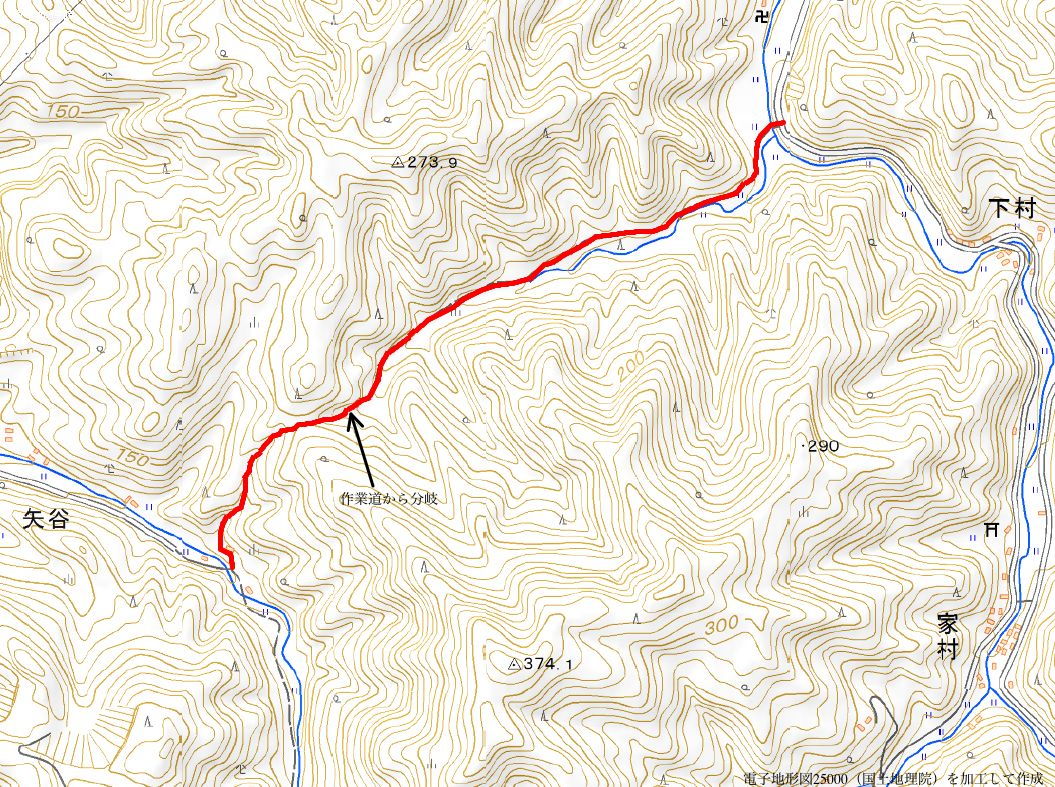 | 秋吉へ下りてから、矢谷へ帰るのには、同じ径を帰るのが近いですが、再度、急な山を越える気は起こりません。市道を大回りして帰るのは距離が長く、下村と桑上の間の桑並川の西谷橋から谷を入って山を越える旧道が距離が短くなるので、この山越えの旧道を通って帰ることにしました。(橋の名前から、ここは西谷というのでしょう。) 西谷橋から作業道を山へ向かって15分ほど進むと、広い作業道が終わり、少し狭くなった作業道が右前方へ上がっています。6分ほど上がると、作業道は左へ曲がり、細い径がまっすぐ続いていますが、ぬかるんだ湿地のような状態で、避けるように山際を通って上がりました。谷には笹などが多いですが谷の奥へ向かい、右手の斜面を稜線へ向かって上がります。斜面を上がると、竹林となって稜線の鞍部が峠になっています。 峠を越え笹原の斜面を5分ほど下がると、円形の石垣に囲まれた穴がありますが、なんなのか検討がつきません。ここから谷は細くなり、径らしきものはありません。しばらく細い谷を下がると、小さな径が現れ、前方に民家が見えてきます。民家の間の細い道を抜けると、矢谷の集落の舗装道路に出てきました。 |