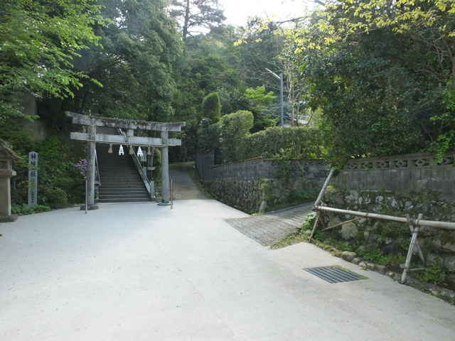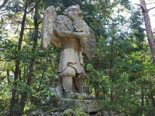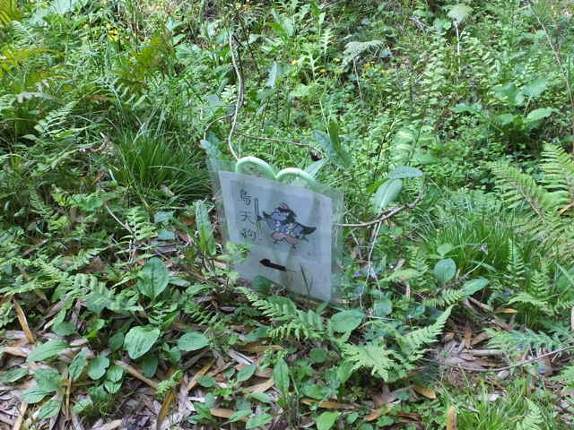| 旧版地形図で玉造からの旧道を調べていると、玉作湯神社から上がった山の上に鳥居のマークが有り、ネットを調べてみました。現在の地図には表記がありませんが、金刀比羅宮といい、烏天狗や不動明王の石像があるとのことなので、上がってみることにしました。 玉作湯神社で作業をしている方に聞いてみると、「今は上る人もいないので、道は荒れていると思う。」とのことでした。 玉作湯神社の一の鳥居をくぐり、二の鳥居の右横から上がって行く道があります。2分ほど進むと、石段と作業道らしい道が別れていますが、どちらも同じ場所へ続いています。神社裏山の要害山城跡への案内標識を左手に見て、直進します。同じ場所の右の道端の草むらに「烏天狗」の案内標識があり、矢印が直進を示しています。その先に建物があり、その手前から左へ径が別れて竹林へと向かいます。竹林の手前に「一の平」を指し示す標識があり、その標識を横に見て竹林へ直進します。 神社で聞いた様子とは異なり、きれいな広い径が竹林を上がって行き、2分ほどで竹林を抜け、木々の間の斜面の径を5分ほど上がって行くと、十字路があります。(後ほど、確認すると左折すると、西忌部町への旧道で、右折すると麓の清巌寺の近くへ下りました。) 十字路を直進するとすぐ、石段のある急坂になり、石段の上部で左折すると、神社への階段があります。石の階段の下の方は少し笹がはえて、あまり訪れる人のいないことを物語っています。石段を上がると古い狛犬があり、その脇の石灯籠には、「天明二壬寅」(1782)と刻まれていました。またその横には不動明王の石像があり、その台座には「萬延二年辛酉三月、幸八作」(1861)とありました。その奥に、拝殿と本殿があり、本殿の中に石造りの社が納められていました。これが金刀比羅宮で、その横の奥に大きな石の上に立っているのが烏天狗の石像でした。 ネットの情報では、「800年前に開山された真言宗の寺だったようだが、廃仏毀釈により神社となった。」ようです。 帰りに、途中(9:45)にあった十字路から西へ下ってみました。はっきりした径があり、3分ほど下がった道路脇の斜面の上に、5角形の石柱があり、天照大神などが刻まれていました。これは、社日信仰によるもので、石柱の各面には「天照大神、大己貴命、稲倉魂命、埴安媛命、少彦名命」が刻まれています。さらに下がっていくと、民家裏の擁壁の上に出て、擁壁の間から清巌寺の墓地の近くへ下りてきました。 神社で聞いたのとは違い、道がきれいだったのは、この道が鉄塔の巡視路のためではないかと思われます。神社の石段の前からは、次の鉄塔への巡視路が伸びていました。 |