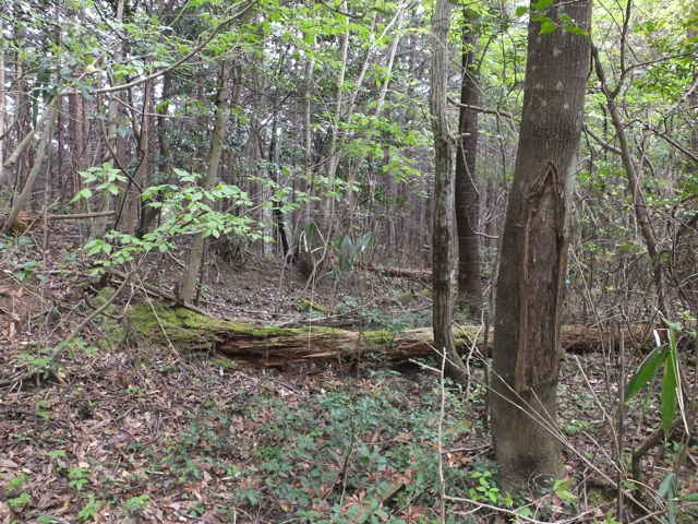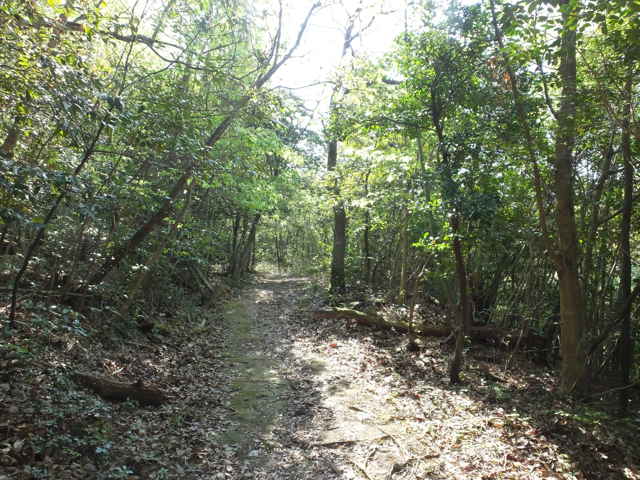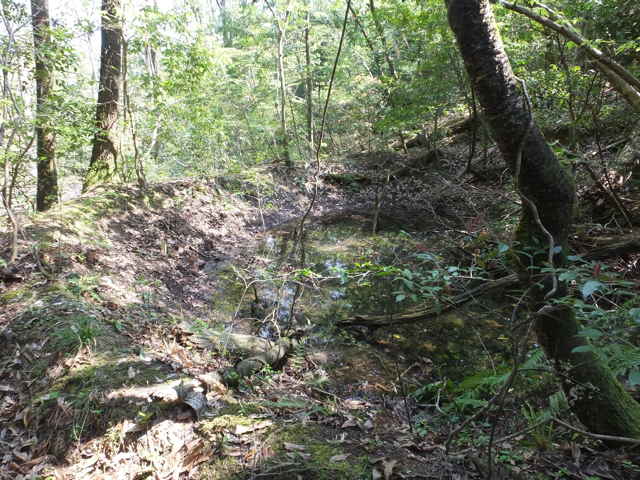 | 旧版地形図にある玉造の玉作湯神社から山を越え、現在の林道一崎柳原線と交差し、西忌部町堂廻へ至る旧道を歩いてみようと思いました。 山の上にある金刀比羅宮への径の途中から東へ向かって山を越えるようですが、最初は神社への径からの分岐がわかりませんでした。神社からたどれないかと、神社の後ろの林内へ入ると、U字形になった踏み跡が、東へ続いていました。4分ほど踏み跡をたどると、左右に続く径に出会いました。左の径に石段があるように見えるので、左へ上がってみました。1分ほど径を上がると小さな溜池があり、ぬかるんだ径が下がっていました。径は西へ曲がり2分ほど行くと、神社へ向かった時(9:45)の十字路に合流しました。 神社裏から下りた場所へ引き返す途中で、北へ曲がるところに東への分岐があることがわかりました。神社裏から下りたところへ引き返し、東へ伸びる径を確認しましたが、5分ほど行くと藪になってしまったので引き返しました。10:35の分岐が旧道になるだろうと、神社への径に再度引き返し、確認することにしました。 |