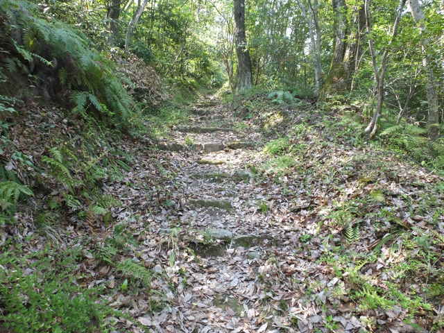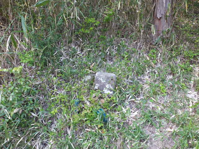 | 布志名への旧道入り口を確認してから、鉄塔巡視路を歩いて、最初の出発地の玉造へ帰ることにしました。 民家の入口の道路脇に埋もれた石に花筒に花が活けられたいたので、農作業の方に聞いてみると「お地蔵様で一丁地蔵で、この下の石野宮神社の近くと、この上にもある。」とのことでした。 一崎から玉造への市道を上がって行くと、道路脇の茂みの中に一丁地蔵があり、峠の手前から西へ向かう谷へ入っていきます。谷へ入って3分ほど行ったところの径の脇にも一丁地蔵と思われるものがあり、その先で巡視路と分かれて笹薮の中に踏み跡がありました。多分、この踏み跡は西忌部町一崎から玉造への旧道ではないかと思われます。 巡視路は急斜面の階段を上がり、右へ分岐したところに鉄塔No.27がありました。鉄塔のある尾根を越えると玉湯町玉造となり、巡視路は谷へ下り、小さな川を渡って行きます。川を渡ると、コンクリート舗装された広い作業道に出会い、分岐を上に上がって行くと、8分ほど上がると作業道が終わりました。途中で右へ入る径があったので、その径が巡視路と思われ、引き返しました。 右へ林内へ入ると、すぐに鉄塔N0.28がありました。鉄塔の手前から竹藪に向かって径が伸びており、斜面をトラバースする平坦な径が続きました。13分ほど平坦な径を進むと、案内標識から急な斜面を上がって行きます。3分ほど上がると、玉造から西忌部町堂廻へ向かう旧道と交差し、その向いの急斜面に巡視路は続いています。急斜面を上がると1分ほどで鉄塔N0.29に到着し、その先に巡視路は続いていますが、今回はここまでとしました。 |
