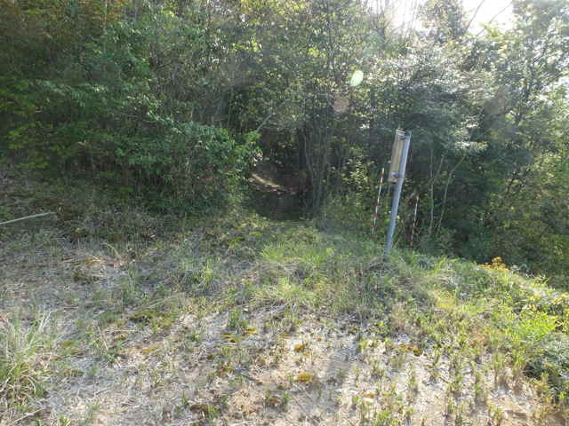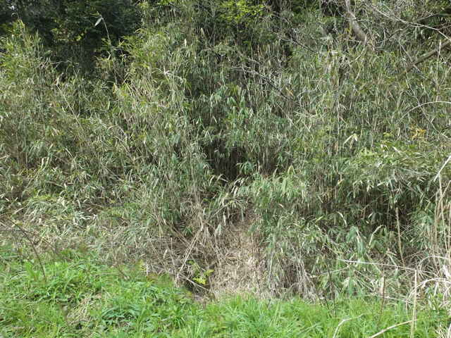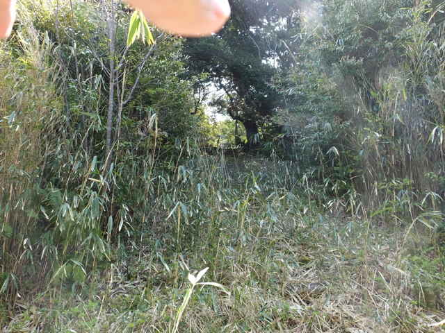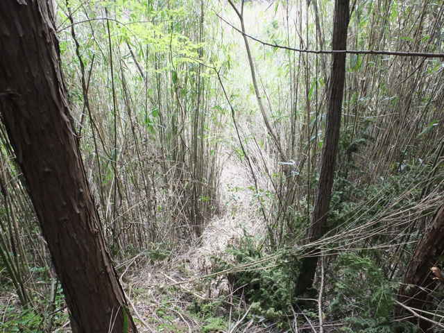 | 西忌部町 11:47 斜面を左へと回る。 | 11:48 急斜面から笹薮に下りる。 | 11:49 出てきた笹薮を振り返る。 |