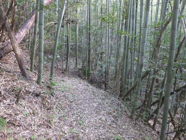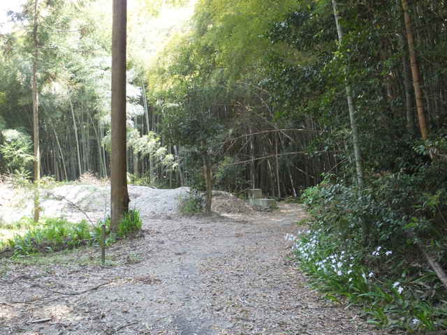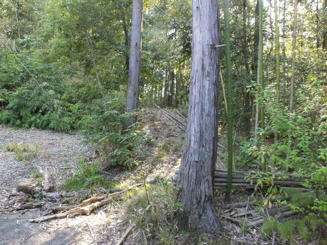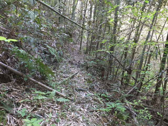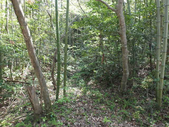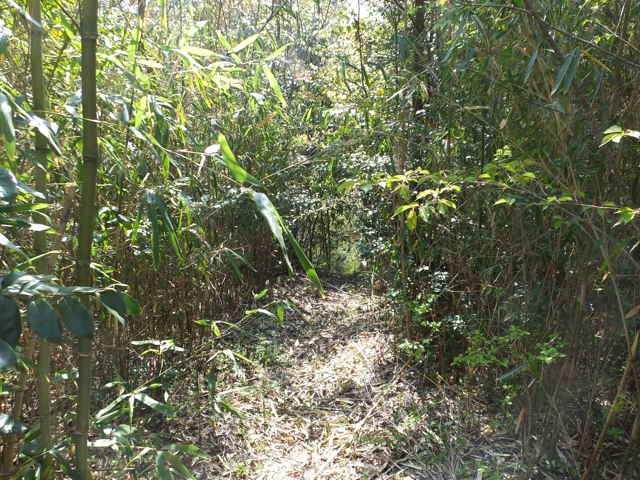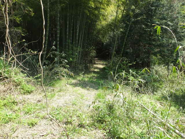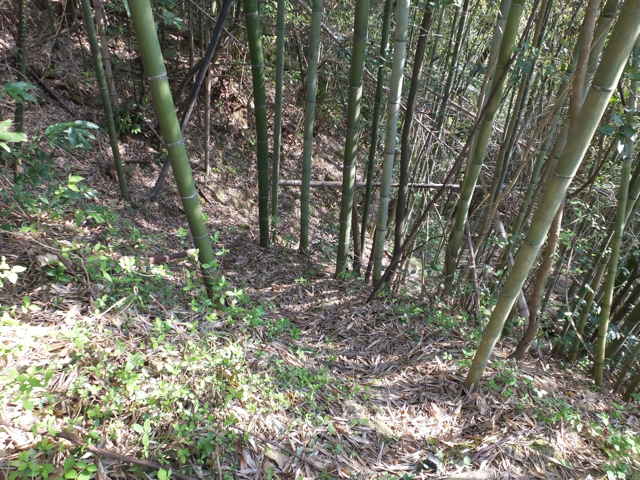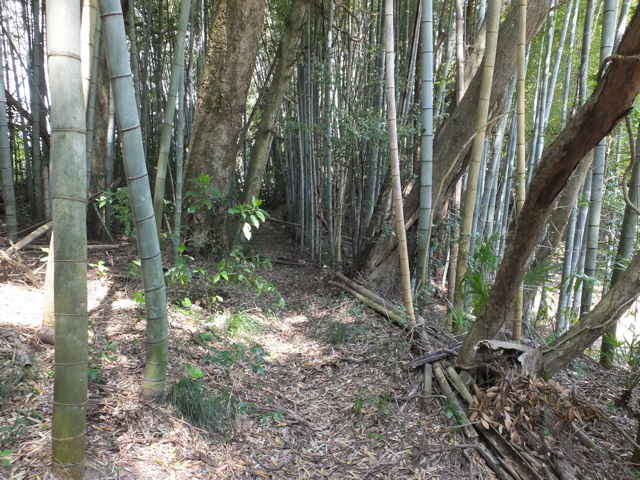 13:02 作業道が分岐する。 | 分岐の間の竹林に旧道らしき径がある。 |