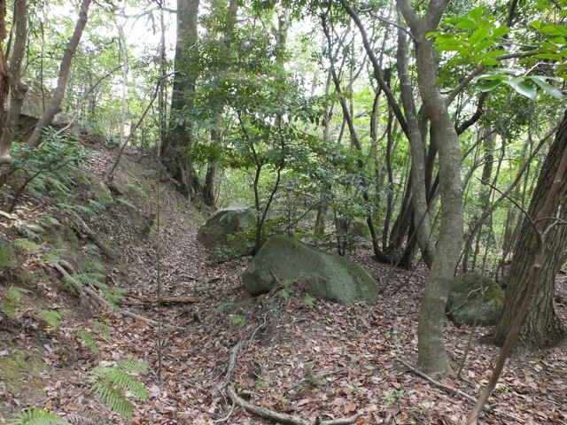 | 玉湯町玉造 11:09 植林地との境に径がある。 | 11:10 大きな岩の先で踏み跡が分岐する。 | 11:13 直進し尾根を下がる。 |