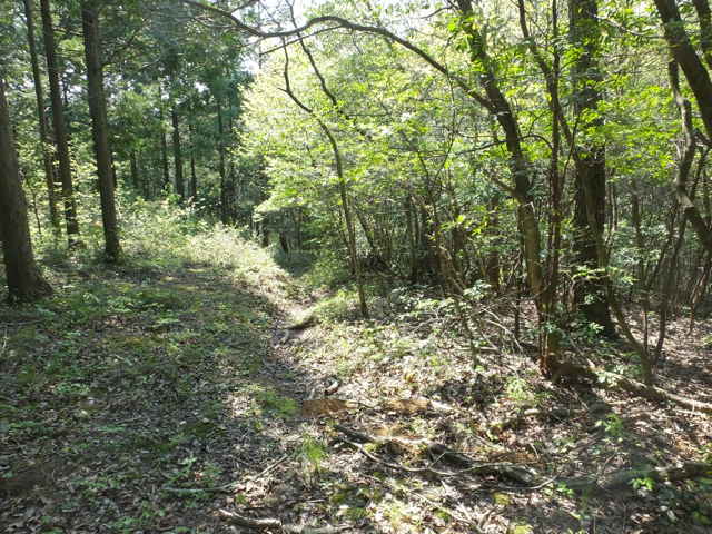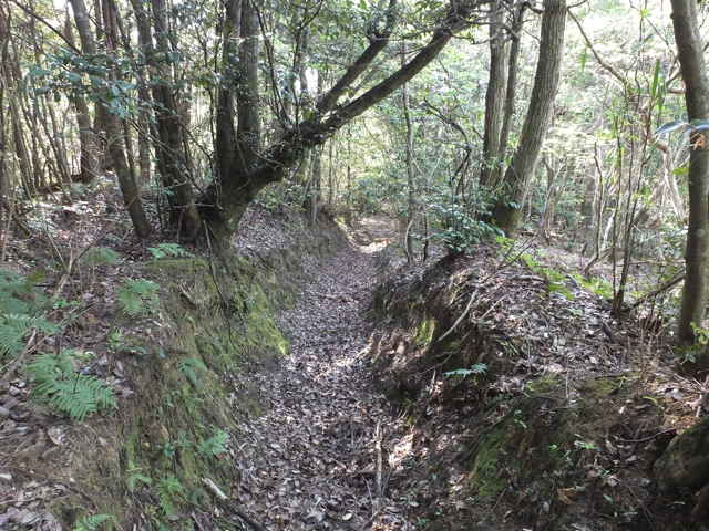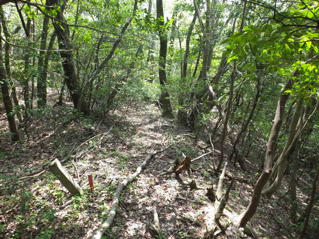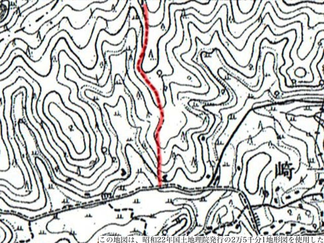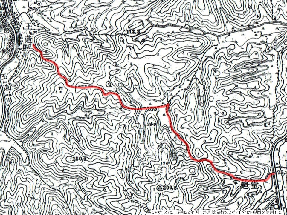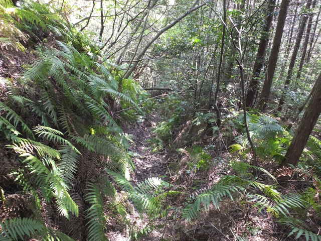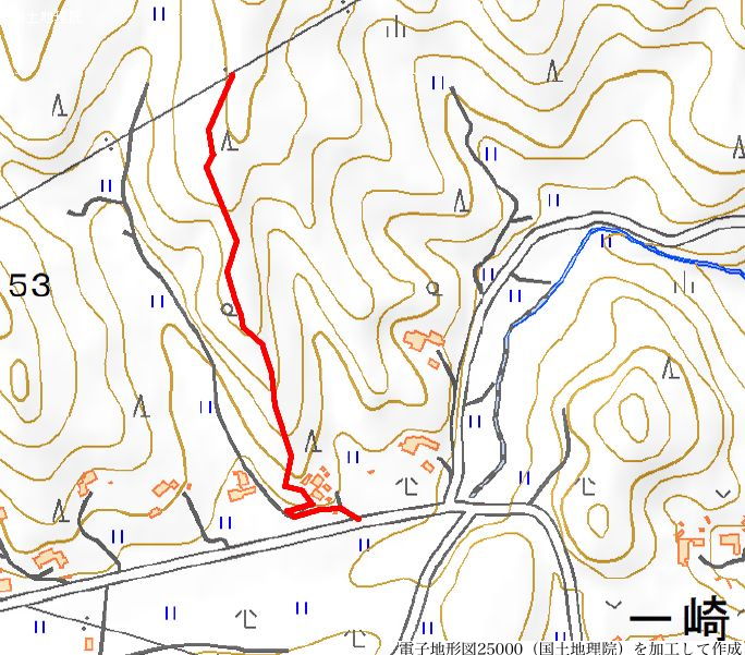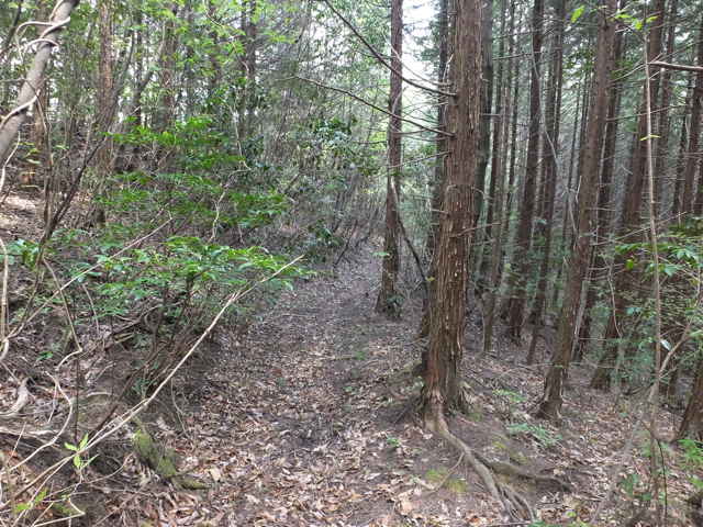 | 旧版地形図にある玉造の玉作湯神社から山を越え、現在の林道一崎柳原線と交差し、西忌部町堂廻へ至る旧道を歩きました。 金刀比羅宮への径の途中の十字路から左へ分岐し、3分ほど上がったところの分岐を直進します。左は鉄塔の巡視路です。径ははっきりしており、あまり荒れた感じはないので、最近でも使われているのかもしれません。小さな峠に上がり、4分ほど下がっていくと大きな岩があり、踏み跡が分かれていました。直進して尾根を下がってみましたが、方向が違ってくるので、分岐まで引き返し、左へと進みました。 ピークを周って隣の尾根に向かうルートですが、左へ周ったところからサルトリイバラや枝が伸び放題の藪になってきました。踏み跡は続いているので、5分ほど藪こぎをして、やっと藪を抜け出しました。この藪の径が旧道で間違いないと思われますが、藪を抜けたところで、尾根の植林地の境を下がってくる踏み跡があるので、現在はピークを越えてくる径があるのかもしれません。 藪を抜けたところから、植林地と雑木林の境の尾根に踏み跡がありますが、やがて踏み跡は不明になってしまいます。そのまま尾根を下がっていくと、急斜面になってしまうので、左へと斜面を下がると、笹薮が切り払われたところがあり、林道一崎柳原線との間の元耕作地へ下りてきました。 地図を確認すると、急斜面になる手前から、左へと下りていくのがルートのようです。 林道一崎柳原線を200mほど東へ下がると、南へ向かった谷に広い作業道らしい径があります。この径を10分ほど入っていくと、ウツギがたくさん生えた、畑の跡地のような場所に踏み跡が続いています。谷の奥まで入ると、踏み跡は不明になりますが、左の林内の谷を上がってみました。 谷の奥へ上がって行くと、斜面に踏み跡のようなものがあり、その上にU字形になった古い径がありました。3分ほど上がると峠になり、はっきりした径が下がっています。10分ほど支障もない広い径を下がっていくと、広い作業道に出会いました。作業道を下りていくと分岐があり、分岐の角の竹林の中に踏み跡が下がっており、旧道と思われました。踏み跡を谷へ下がっていくと、溜池の手前から藪となってしまい、引き返しました。 分岐へ引き返し、作業道を右へ曲がって行くと、4分ほどで民家の間から市道へ下りてきました。 |