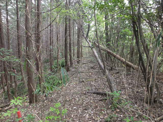 | 西忌部町 11:30 やっと藪を抜けた。 | 11:33 植林との境の尾根を進む。 | 11:35 右に踏み跡がありそうだが尾根を進む。 |