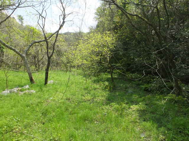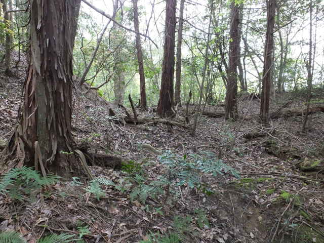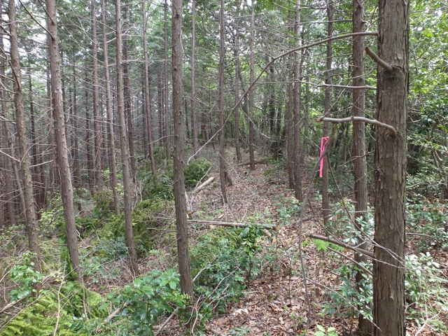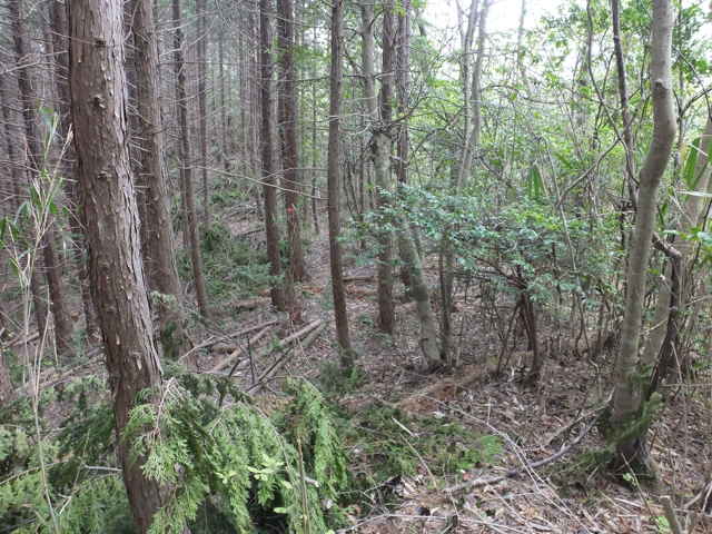 | 西忌部町 12:23 谷の左に径がある。 | 12:27 谷の奥から左の山へ入る。 | 12:29 植林地に踏み跡は見えない。 |