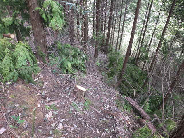 | 西忌部町 11:50 林道から、下りてきた山を見る。 |