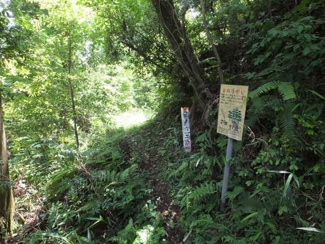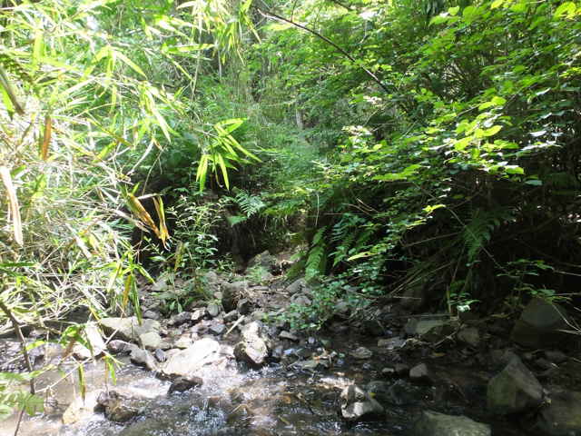 | 長海町 13:30 | 谷の中に標識があった。 | 13:35 谷が分岐し、左の急斜面の谷を上がる。 |