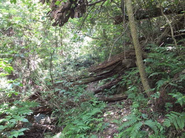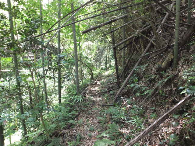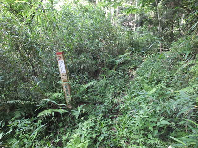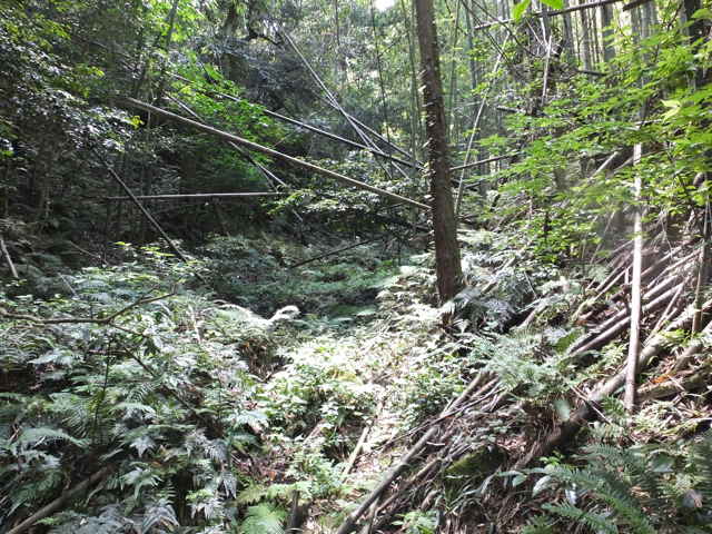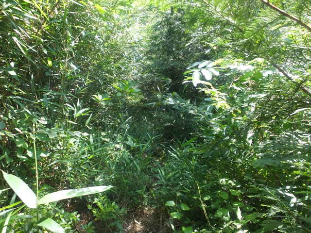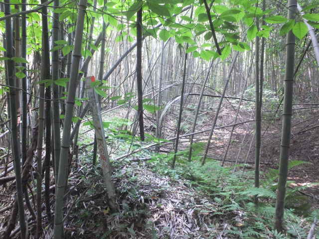 | 長海町 13:04 竹林内に大きな岩がある。 | 13:05 斜面に沿って谷を上がって行く。 | 13:07 巡視路標識がある。径が不明になる。 |