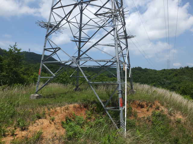 | 15:03 鉄塔No.32へ着いた。 | 長海町 15:03 鉄塔の奥に巡視路が伸びている。 | 15:05 |