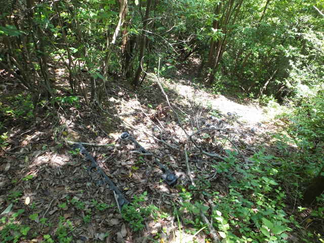 | 15:21 鉄塔の奥から踏み跡がある。 | 枕木町 15:23 荒れた径を下がる。 | 15:24 伐採後の急斜面の荒れ地を下がる。 |