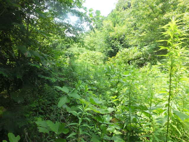 | 新庄町 11:41 右に巡視路の標識がある。 | 11:42 背の高い草に覆われ径は見えない。 |
