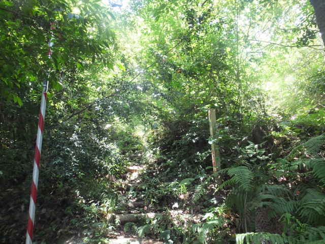 | 新庄町 13:00 堰堤の先の標識から左へ折れる。 | 斜面の階段を上がる。 | 13:01 斜面をトラバースする。 |