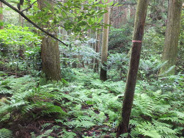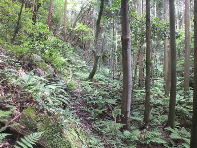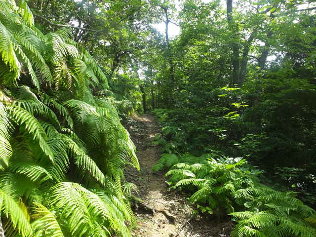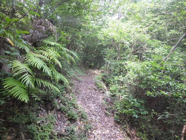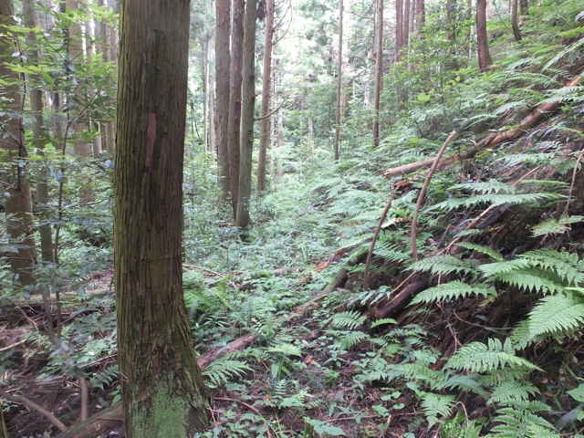 | 今日は先日6月29日に歩いた川原町の島根原子力幹線鉄塔のNo.37からNo.38へのルートが不明だったので、新庄町からたどってみようと思いました。 新庄町から嵩山の中腹へ向かう林道を上がって行きます。しばらく上がると右手の草地の中に巡視路の標識がありますが、No.が消えていて不明(No.35だったのかもしれない。)ですが、多分No.38へのルートではないかと思われました。しかしこの巡視路はすぐ背の高い草やススキに覆われ、径も見えず、進めそうにないので諦めました。 林道へ帰ってさらに上がって行くと、右手に島根原子力幹線No.39への標識があり、巡視路が林内へ向かっています。谷へ入って行くと、また標識があり右へ折れ、さらに右へ折れて行くと、巡視路は急斜面をつづら折れに上がって行きます。急斜面を息を切らしながら15分ほど上がると鉄塔が見えますが、巡視路は左へ回って斜面を上がって行きます。島根原子力幹線鉄塔No.39の周りは、クズに覆われ藪になっていて、近づくこともできず、No.38へのルートは確認することができませんでした。 林道へ引き返し、鉄塔No.40へ向かうこととし、さらに林道を上りました。林道を3分ほど上がり、大きくカーブする手前の左に巡視路の標識があり、鉄塔No.40を指していました。谷を上がって行くと、砂防堰堤が有り、その脇からさらに谷を上がると、標識があり、左へ折れていきます。 斜面をトラバースし、隣の谷へ回って谷を上がって行きます。谷を上がって行くと、尾根筋になり、植林の中を上がって行くと、鉄塔が見えてきます。この鉄塔も敷地は背丈以上もあるススキに覆われ、次の鉄塔No.41へのルートは確認できませんでした。ススキをかきわけて、なんとか鉄塔の下まで行くと、ここだけススキは短くなっていて、中海方向の展望が開けていました。 林道まで引き返し、今日はここまでかなと、山を下ることにしました。林道を下がって行くと、右手に巡視路標識があり、鉄塔No.36を指していました。別系統の送電線があるようです。 竹林を入るとすぐに正面は斜面となって、急斜面をつづら折れに上がって行きます。15分弱で鉄塔に到着しますが、鉄塔からは周りの木々が邪魔をして展望はありませんでした。 鉄塔の手前から左(南)へ斜面を下がる踏み跡があり、たどってみました。急斜面をつづら折れに下がって、さらに谷沿いを下がって行くと、鉄塔No.37への標識がありました。標識から右へ折れ、谷を上がり、谷を渡って右へ回って行き、さらに谷を上がって行きます。斜面を上りきると、尾根に標識があり、右へ進むとすぐに鉄塔No.37がありました。 鉄塔の奥にNo.38への標識がありますが、その上に尾根があり、広い尾根径が続いていました。どこまで行けるのかたどってみました。 尾根径は下がって行き、5分ほど行くと巡視路の分岐がありますが、直進すると2分ほどで鉄塔No.12がありました。先程の鉄塔とは別系統の送電線のようです。この鉄塔の先への巡視路を探しますが、見当たりませんでした。鉄塔No.11へは先程の分岐だったようです。 鉄塔No.38への標識のところまで引き返し、巡視路を先へ進みました。巡視路はすぐ斜面を下り、谷を下がっていきます。12分ほど谷を下がって行くと、畑の脇の作業小屋の後へ出てきました。その先の右に標識があり鉄塔No.38を指していました。巡視路へ入ると、4分ほどで鉄塔へ着きましたが、まったく展望はありませんでした。 鉄塔から引き返し下がって行くと、市道朝酌上宇部尾線の走る上宇部尾町の谷へ出てきました。谷の向こうに見える鉄塔がNo.39になると思われます。 この地域の島根原子力幹線の鉄塔(No.35〜37、39、40)はどことも敷地が背の高い草に覆われています。他の鉄塔では、除草されているのが普通ですが、管理の仕方が違っているのでしょうか。 |