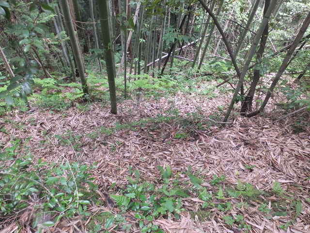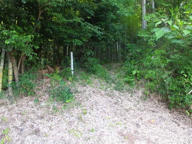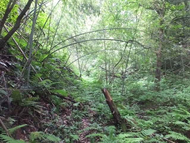 | 新庄町 13:55 林道を下がり、右に巡視路標識がある。 | 鉄塔No.36へ向かう。 | 13:57 竹林内を進む。 |