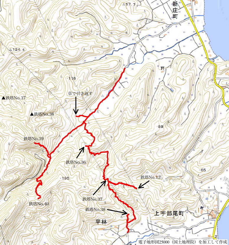 | 新庄町 14:53 直進し、鉄塔No.12へ向かう。 | 14:55 鉄塔No.12 | 15:03 鉄塔No.38への標識に引き返す。 |