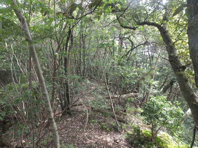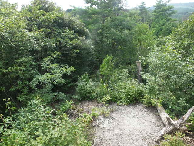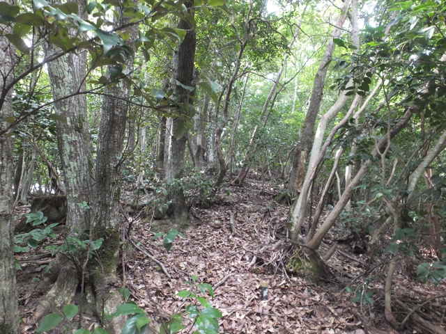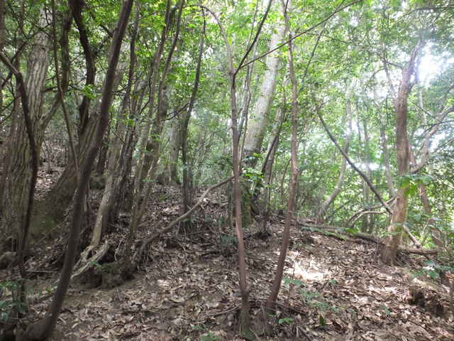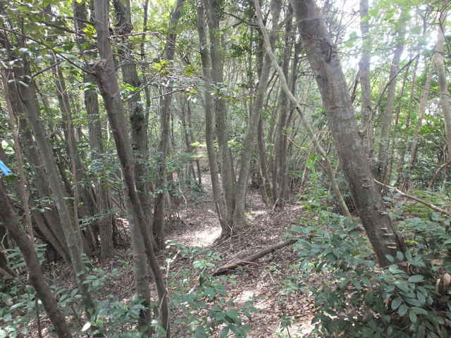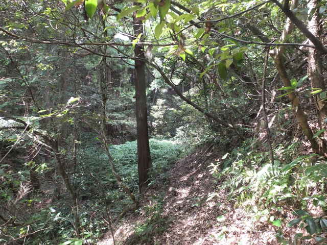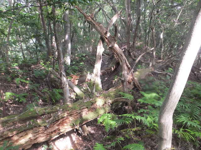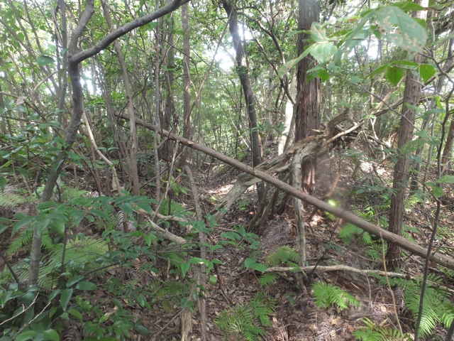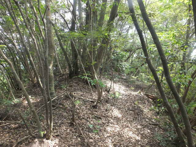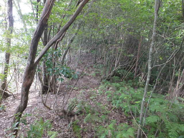| 昭和22年発行の旧版地形図を見ると八雲町熊野の稲葉から谷を入って、山越えをする径が描かれているので、確認しようと出かけました。同じ山の、林道島村線から山越えをして、二つ西隣の谷へ下りる径(現地形図にある破線の径)を、2016年3月20日に歩いているので、帰りはこのルートを通ろうと思いました。 稲葉地区の常栄寺の近くにある稲葉集会所の前から、谷へ向かって作業道が続いています。作業道を2分ほど入ると、草刈りされた径が終わり、その先には草に覆われた作業道が続いているように見えます。通れるかどうか不安になりますが、入ってみるとまだ草はまばらなので、通り抜けることができました。草地を抜けると作業道は終わり、山へ入るようになります。山の入口はササに覆われていますが、ササはまばらで、右手に見える溜池の脇に細い踏み跡が続いていました。溜池の脇を抜けると、少し開けた谷へ出てきました。 谷は右へ曲がっており、谷間を上がっていきましたが、踏み跡はほとんど不明です。旧版地形図を見ると、谷の奥へ入らず途中から斜面を尾根筋へ上がるようになっているので、適当なところから、谷の左側の斜面にとりつきました。踏み跡は見えませんが、急傾斜の斜面を木々に掴まりながら尾根に上がりました。(あとで旧版地形図をよく見ると、谷へ入ったところから、すぐ斜面に向かっているように思われます。) 尾根にはしっかりした踏み跡が上下に続いており、尾根を下がったところにある常栄寺あたりから、上る径があるかもしれません。 尾根にははっきりした踏み跡があり、あまり起伏のない径が続いていますが、ところどころに枝が伸びて、通りづらいところもあります。右側の斜面から上がってくるはずの旧道の踏み跡がないかと注意をしていましたが、見つかりませんでした。旧道は、隣の谷を周るように尾根筋を通っていますが、一番奥のピークから直進していまい、径を間違えました。踏み跡が不明になり、間違いに気づいて、ピークまで引き返し、南に向かいました。 南に向かうと、尾根は伐採地との境界となっており、切り株から枝が伸びだして、少し歩きづらくなっています。旧道はほとんど林内を通っているので、眺望はほとんどありませんが、伐採地のピークからは天狗山や空山を見渡すことができました。 ピークから下がって5分ほどで、次のピークへ上がります。ここが最後のピークで、ここから下がったところで、地形図の破線の径に出会い、谷へ下りて行くと、思っていました。ピークから下がると、シダに覆われて踏み跡もはっきりしなくなりますが、少し下がると、上から下りてくるシダのない踏み跡に出会いました。これが地形図の径だと思いましたが、はっきりした径のわりに、いつまで経っても谷へ下りる気配がありません。GPSを確認すると、地形図の径と接した後、分岐して尾根を下がっていました。径ははっきりした踏み跡が続いているので、このまま下ることにしました。ところどころ倒木があったり、シダに覆われていたりしますが、どこに下りるのだろうと思っていると、麓の墓地の裏に下りてきました。 この旧道は、最初の尾根へ上がるルートがはっきりせず、また急斜面なのですが、尾根は旧道らしく踏み跡もしっかりして、起伏もないので、面白いルートだと思います。 どこで地形図の破線の径と別れたのか不明なので、確認してみたいと思います。 |