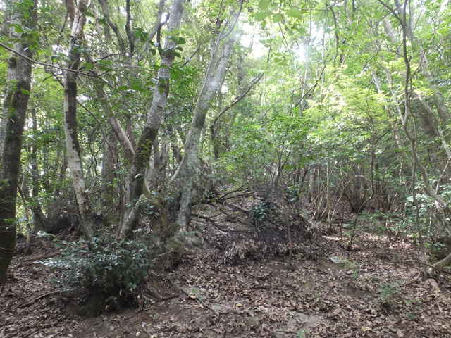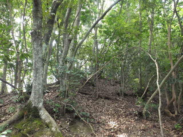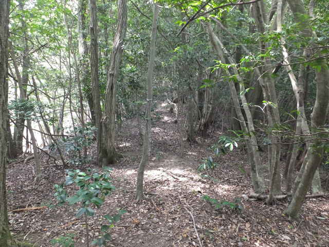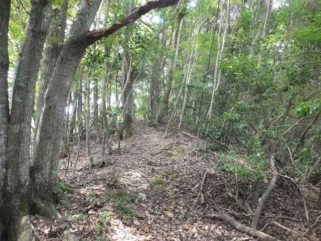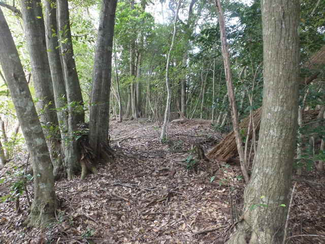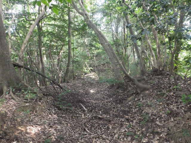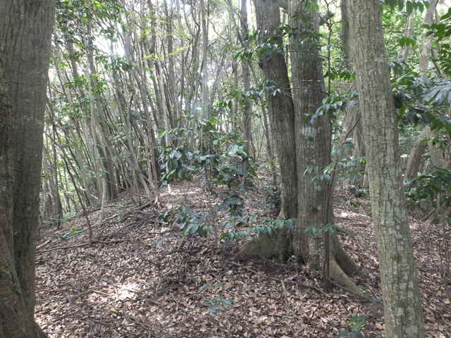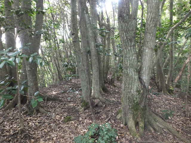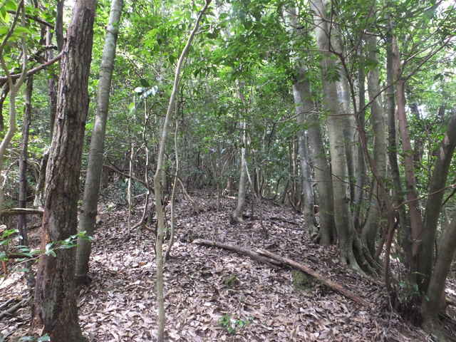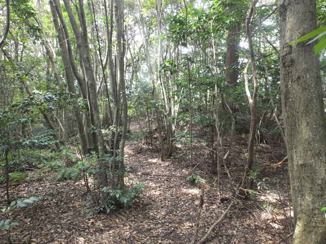 | 昭和22年発行の旧版地形図を見ると八雲町熊野の稲葉から谷を入って、山越えをする径が描かれているので、確認しようと出かけました。同じ山の、林道島村線から山越えをして、二つ西隣の谷へ下りる径(現地形図にある破線の径)を、2016年3月20日に歩いているので、帰りはこのルートを通ろうと思いました。 稲葉地区の常栄寺の近くにある稲葉集会所の前から、谷へ向かって作業道が続いています。作業道を2分ほど入ると、草刈りされた径が終わり、その先には草に覆われた作業道が続いているように見えます。通れるかどうか不安になりますが、入ってみるとまだ草はまばらなので、通り抜けることができました。草地を抜けると作業道は終わり、山へ入るようになります。山の入口はササに覆われていますが、ササはまばらで、右手に見える溜池の脇に細い踏み跡が続いていました。溜池の脇を抜けると、少し開けた谷へ出てきました。 谷は右へ曲がっており、谷間を上がっていきましたが、踏み跡はほとんど不明です。旧版地形図を見ると、谷の奥へ入らず途中から斜面を尾根筋へ上がるようになっているので、適当なところから、谷の左側の斜面にとりつきました。踏み跡は見えませんが、急傾斜の斜面を木々に掴まりながら尾根に上がりました。(あとで旧版地形図をよく見ると、谷へ入ったところから、すぐ斜面に向かっているように思われます。) 尾根にはしっかりした踏み跡が上下に続いており、尾根を下がったところにある常栄寺あたりから、上る径があるかもしれません。 尾根にははっきりした踏み跡があり、あまり起伏のない径が続いていますが、ところどころに枝が伸びて、通りづらいところもあります。右側の斜面から上がってくるはずの旧道の踏み跡がないかと注意をしていましたが、見つかりませんでした。旧道は、隣の谷を周るように尾根筋を通っていますが、一番奥のピークから直進していまい、径を間違えました。踏み跡が不明になり、間違いに気づいて、ピークまで引き返し、南に向かいました。 南に向かうと、尾根は伐採地との境界となっており、切り株から枝が伸びだして、少し歩きづらくなっています。旧道はほとんど林内を通っているので、眺望はほとんどありませんが、伐採地のピークからは天狗山や空山を見渡すことができました。 ピークから下がって5分ほどで、次のピークへ上がります。ここが最後のピークで、ここから下がったところで、地形図の破線の径に出会い、谷へ下りて行くと、思っていました。ピークから下がると、シダに覆われて踏み跡もはっきりしなくなりますが、少し下がると、上から下りてくるシダのない踏み跡に出会いました。これが地形図の径だと思いましたが、はっきりした径のわりに、いつまで経っても谷へ下りる気配がありません。GPSを確認すると、地形図の径と接した後、分岐して尾根を下がっていました。径ははっきりした踏み跡が続いているので、このまま下ることにしました。ところどころ倒木があったり、シダに覆われていたりしますが、どこに下りるのだろうと思っていると、麓の墓地の裏に下りてきました。 この旧道は、最初の尾根へ上がるルートがはっきりせず、また急斜面なのですが、尾根は旧道らしく踏み跡もしっかりして、起伏もないので、面白いルートだと思います。 どこで地形図の破線の径と別れたのか不明なので、確認してみたいと思います。 |