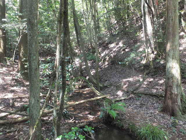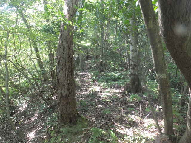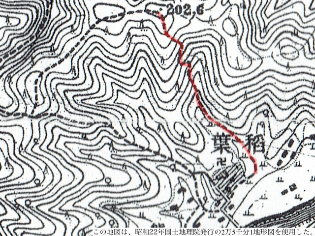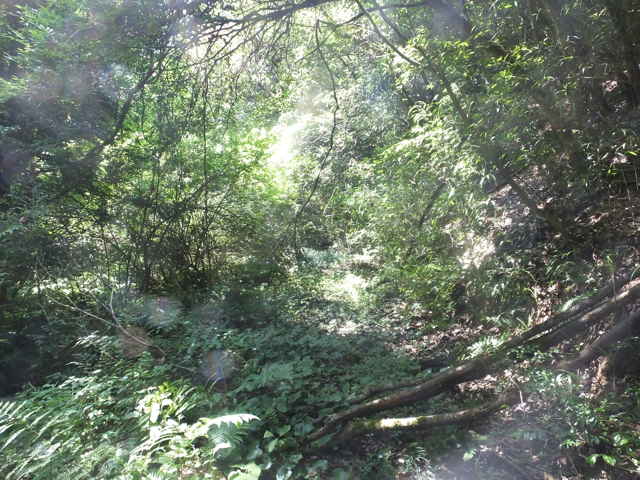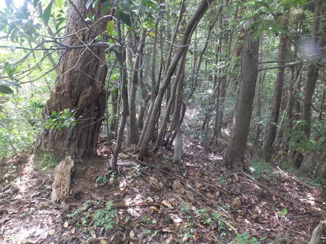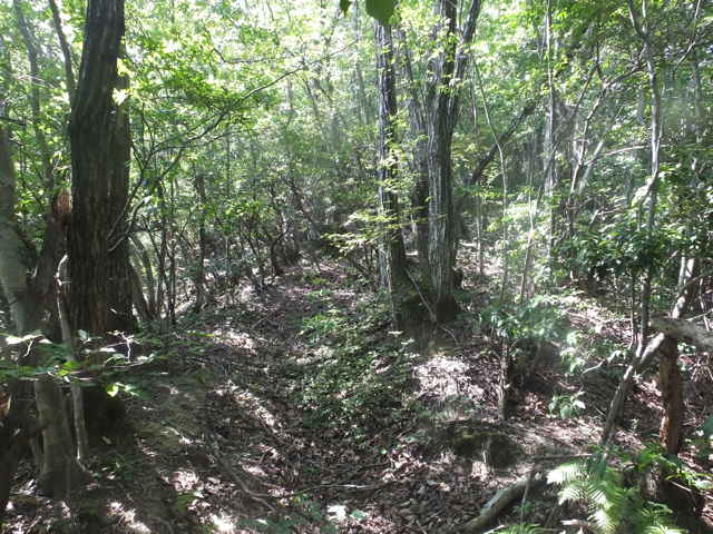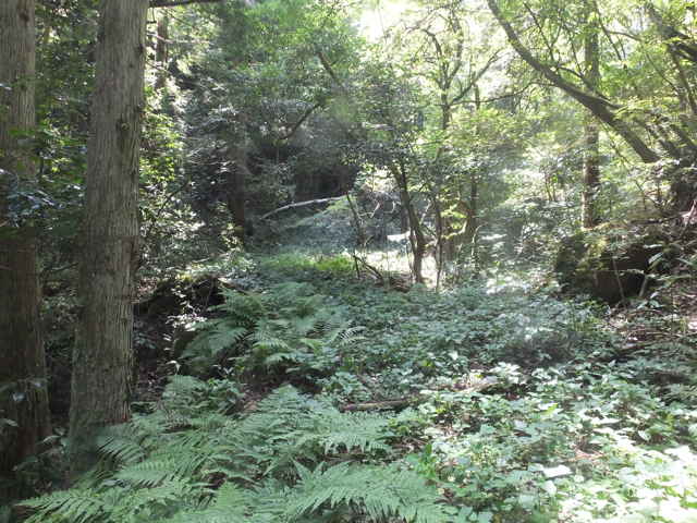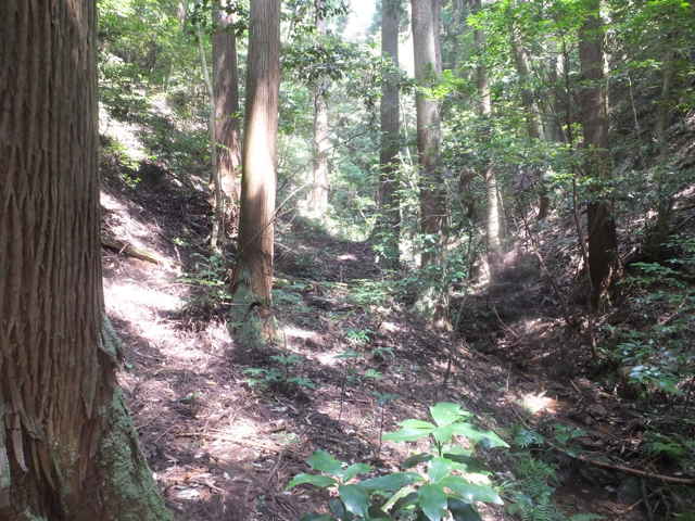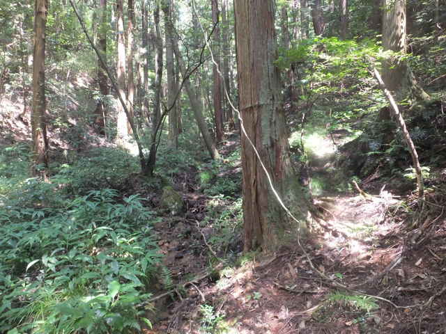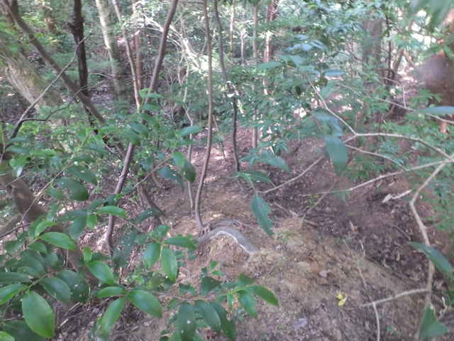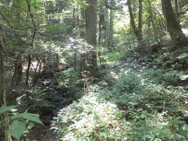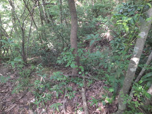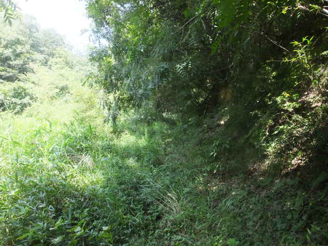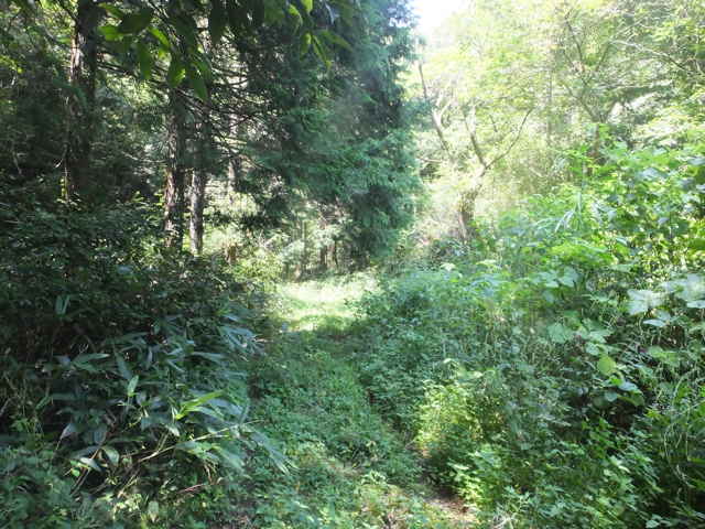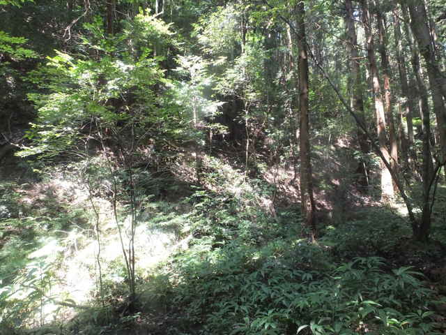 | 先日(8月18日)に歩いた稲葉の旧道の、谷から尾根に上がるルートが若干旧版地形図とは違うようなので、再度斜面に踏み跡はないか確認することにしました。 溜池脇から谷へ入ると左は急斜面で、踏み跡の痕跡は見当たりませんでした。上がれそうなところは、先日の尾根筋の斜面しかないようです。谷の奥へも入ってみましたが、やはり上がれそうな場所はありませんでした。 先日上がった斜面まで引き返し、尾根に向かって上がりました。上がる途中で、交差するような踏み跡はないかと注意をしていると、1箇所だけ左へ斜面を横切る獣道のようなものがありました。しかし、これもたどってみると途中で消えてしまい、違うようです。結局、谷から尾根に上がる旧道のルートは、確かめられませんでした。 尾根から下っていく踏み跡がありそうなので、下ってみました。しばらく尾根を下ると、前方が急斜面となっていました。右の尾根筋が伐採された植林地で、作業用の踏み跡があるので、伐採地の急斜面を下りました。急斜面を谷へ下りると常栄寺の西の谷にある作業道へ出てきました。 |